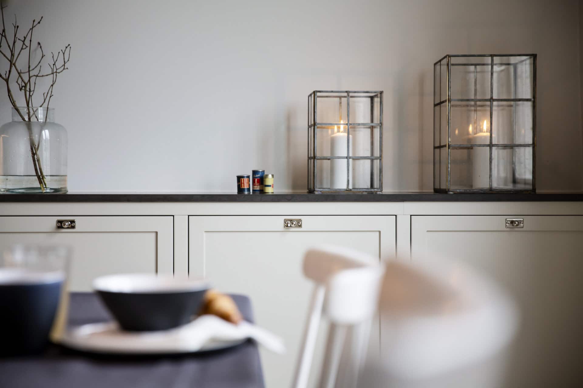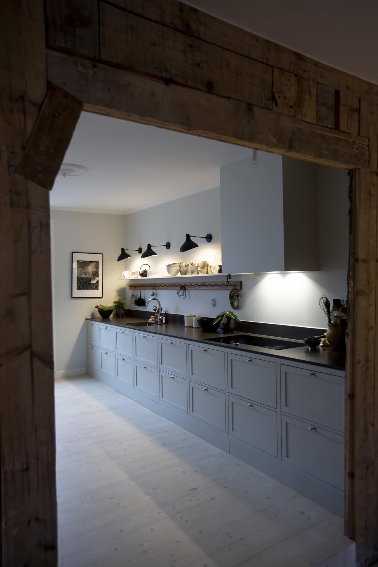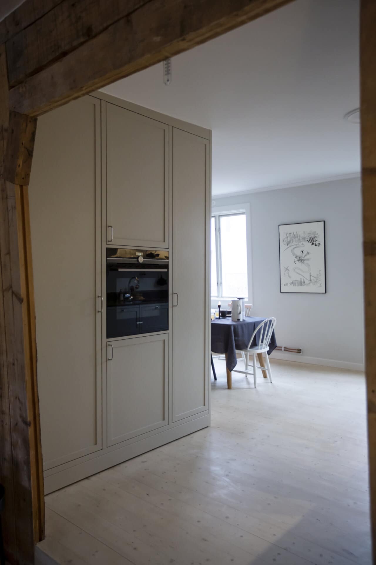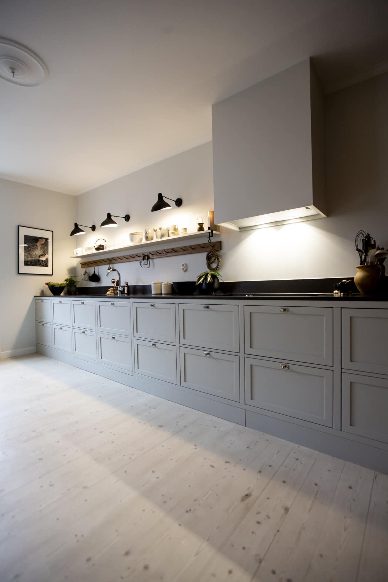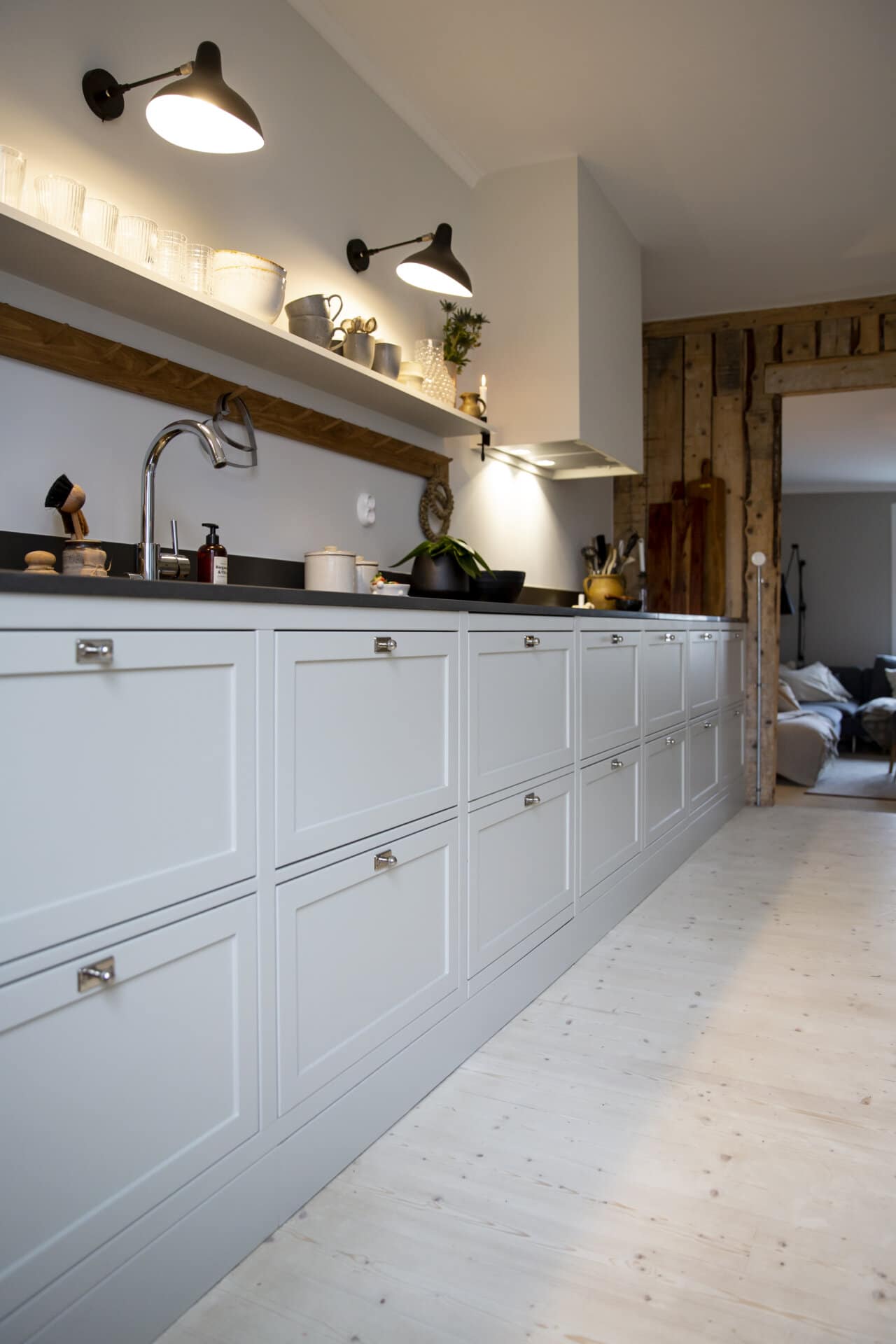 The interior frame doors are reminiscent of how kitchens were built around the turn of the century. The frame doors have a narrower frame width (42mm) which together with the framework around the doors (38mm) creates a nice symmetry. Since everything is built from scratch, we have been able to give all doors and drawers in the cabinets the same width, which adds to the symmetry of the kitchen. The doors are painted in the color NCS 3005-Y20R.