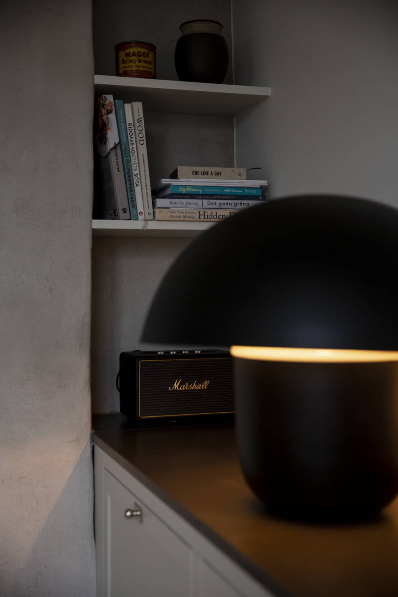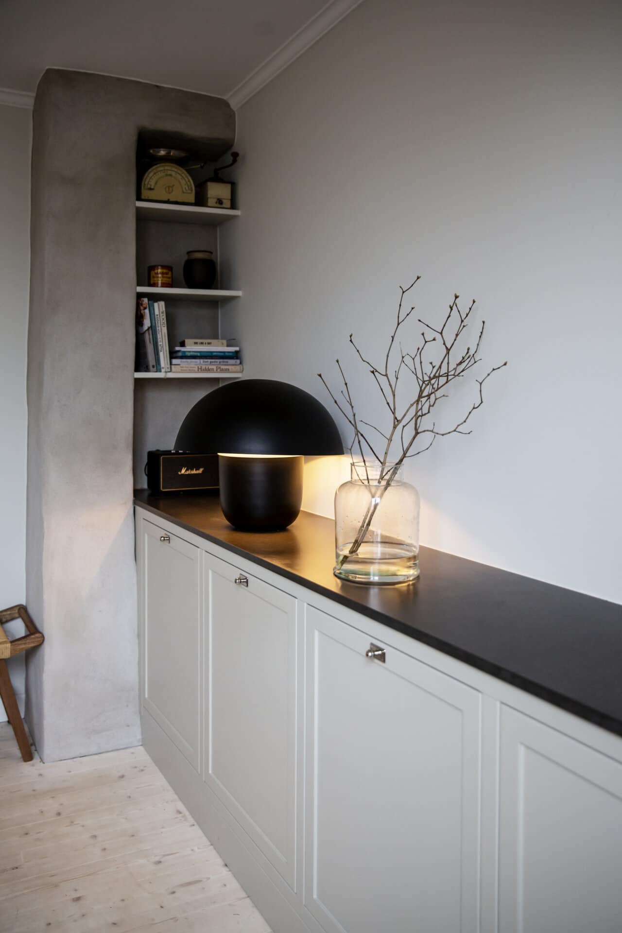 Hand-carved oak knob board, from Ola Sären, together with the wall lighting and painted shelf. Is as beautiful as it is practical. The fan cover is built and painted in the wall color to take as little focus from the beautiful details as possible.