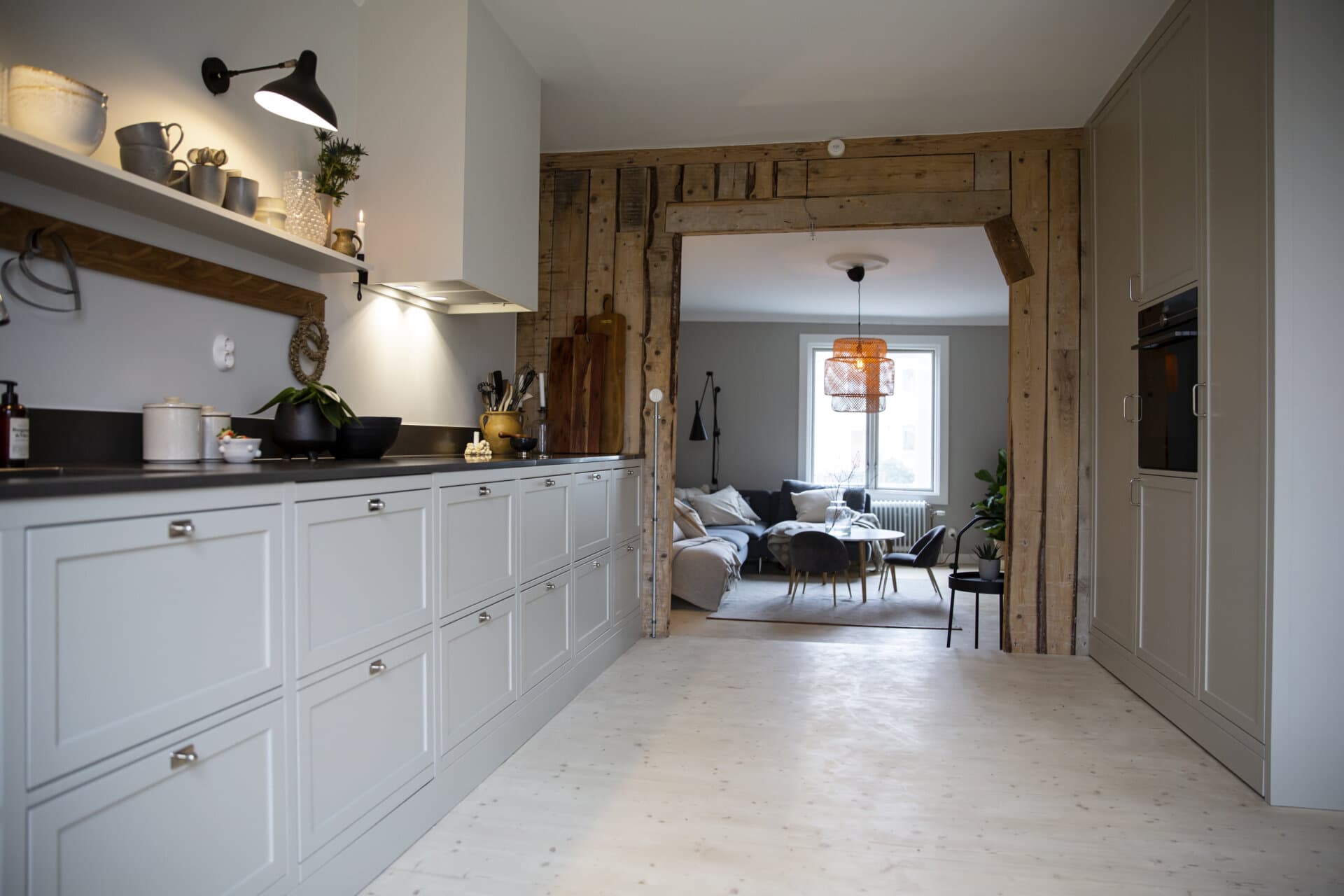 Along the idyllic street, Kungsladugårdsgatan in Majorna, you will find this beautiful home. The white-pigmented solid spruce floors, plastered masonry and plank wall together with the large kitchen give a cozy feeling. With the desire from the customer to combine old with new where you have room for the big family. We have designed and delivered a shaker kitchen in modern style.