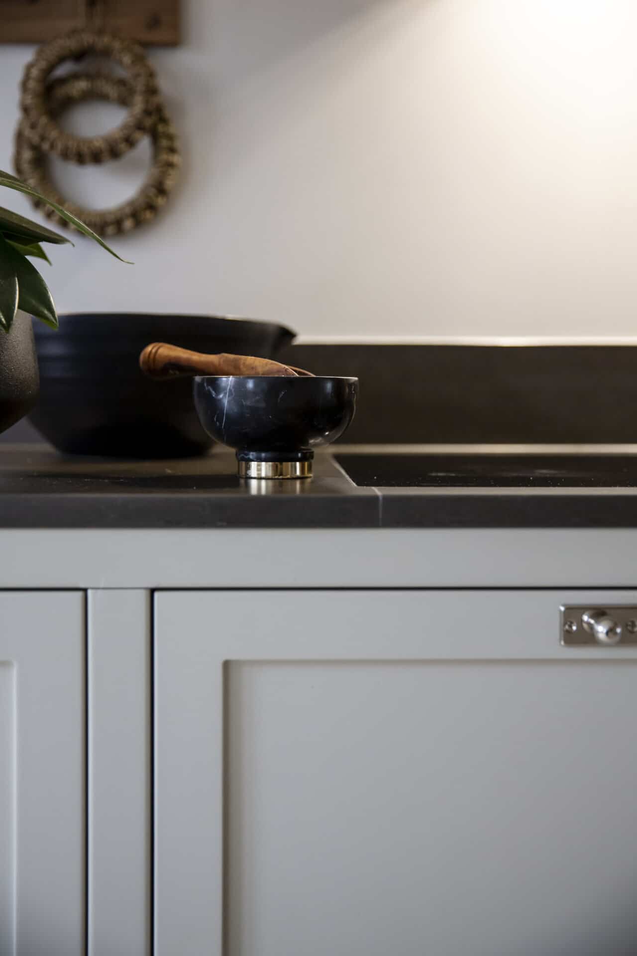 As there is plenty of natural light, the dark brown composite worktop, Silestone Calypso, was a good choice. The Neff hob is flush-mounted in the worktop.
