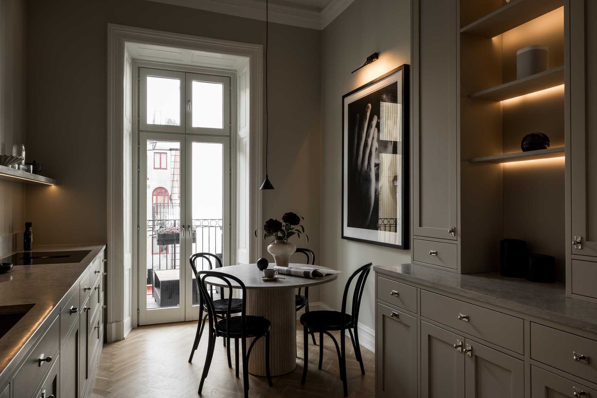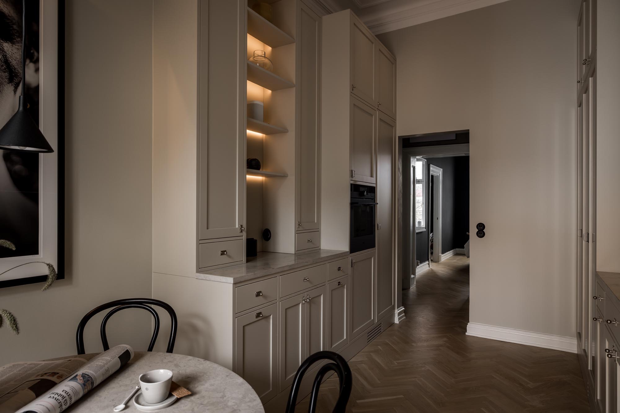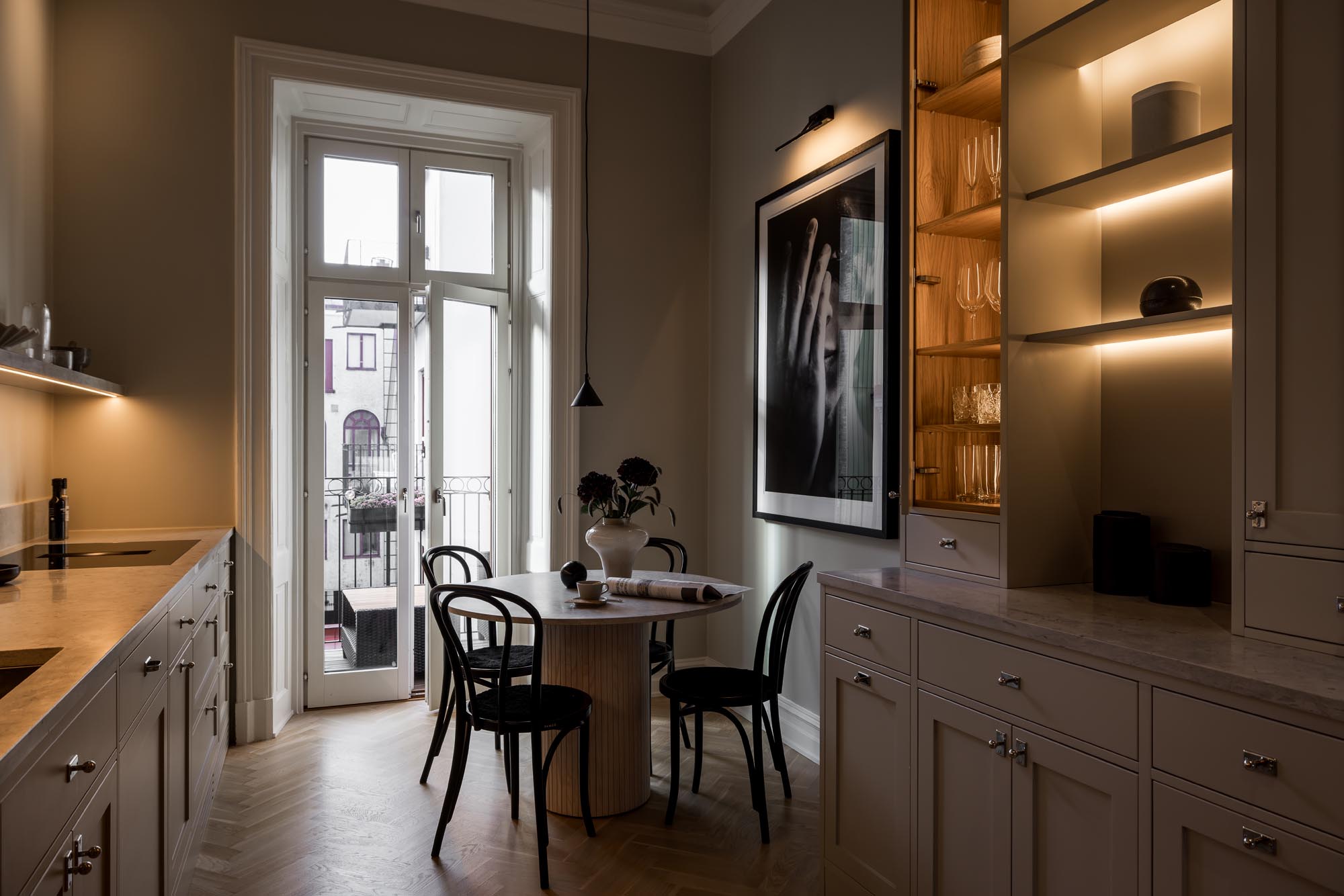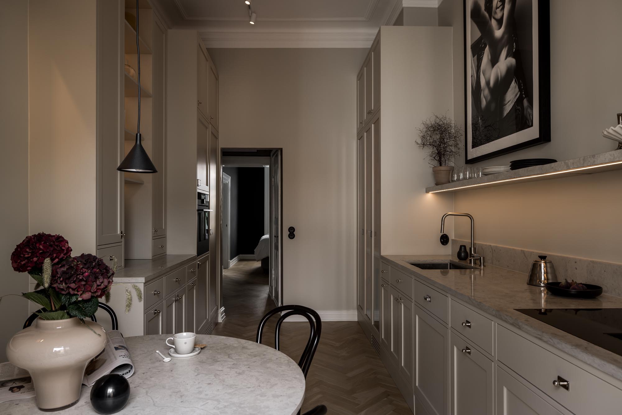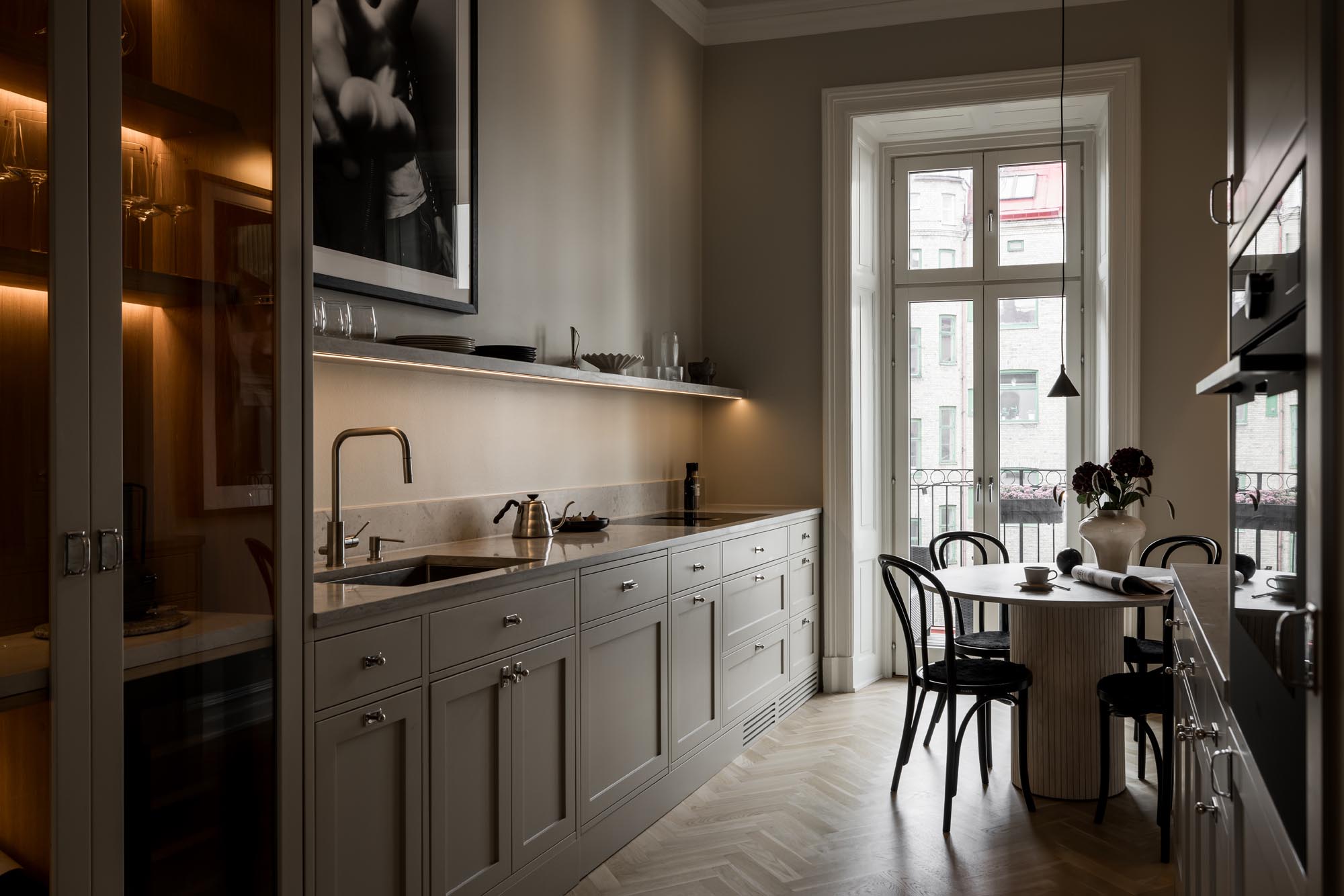 This project combines a timeless Shaker kitchen with the classic turn-of-the-century character of the building from 1875, located in central Gothenburg. With respect for the historical details, such as well-preserved ceiling stucco, we created a harmonious whole where the modern meets the traditional. The kitchen is designed to be both functional and aesthetically pleasing, with a focus on sustainable materials and sophisticated lighting.