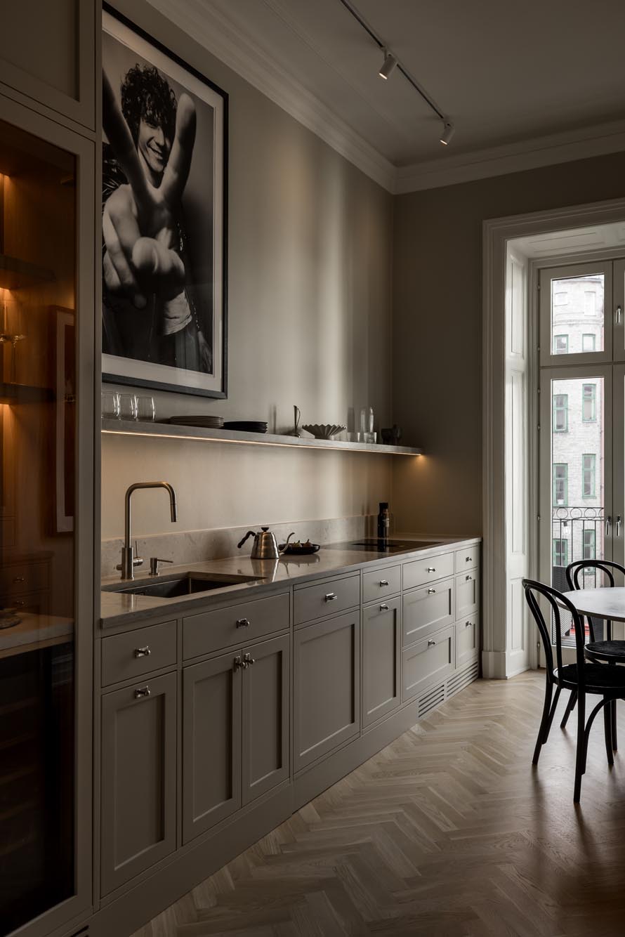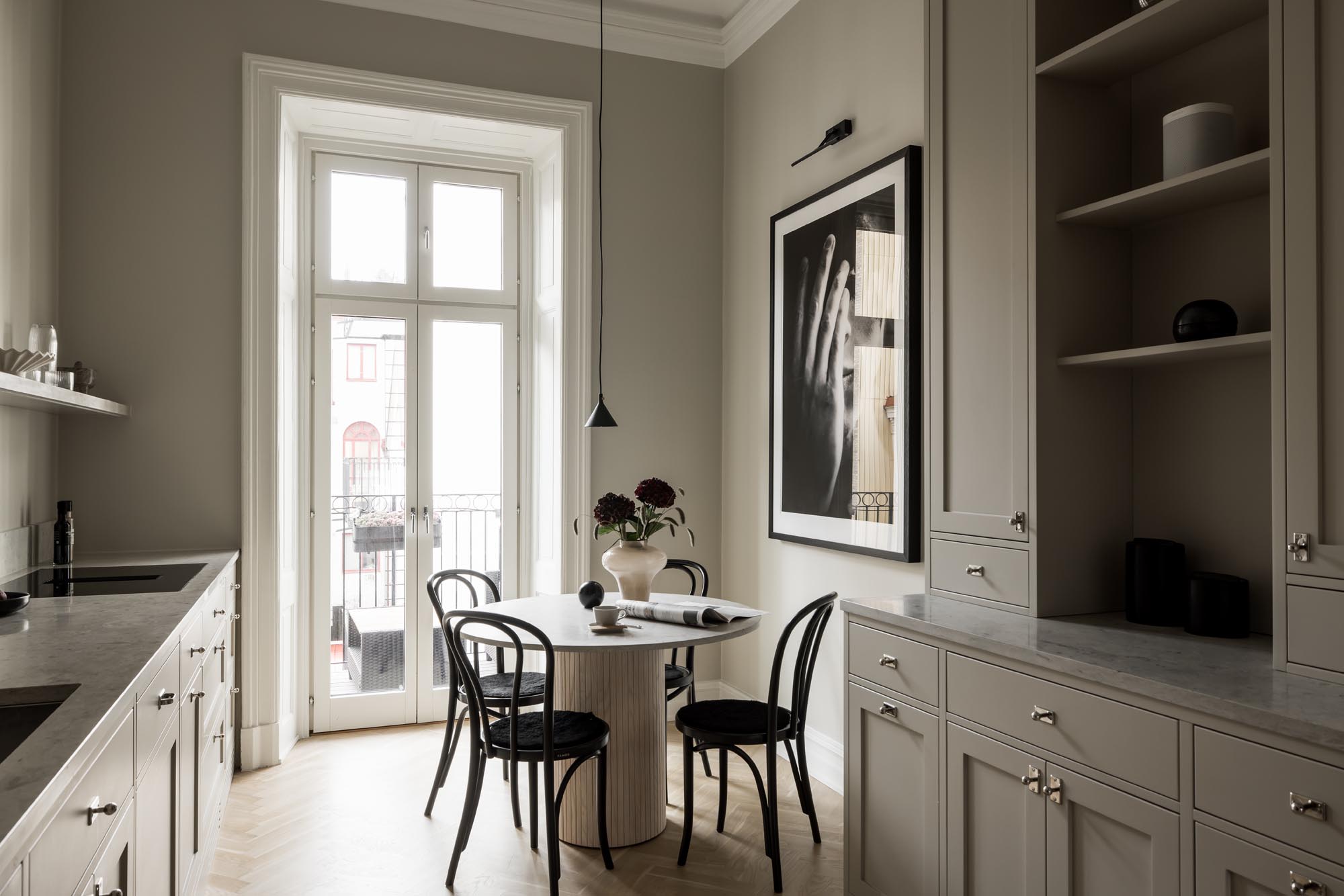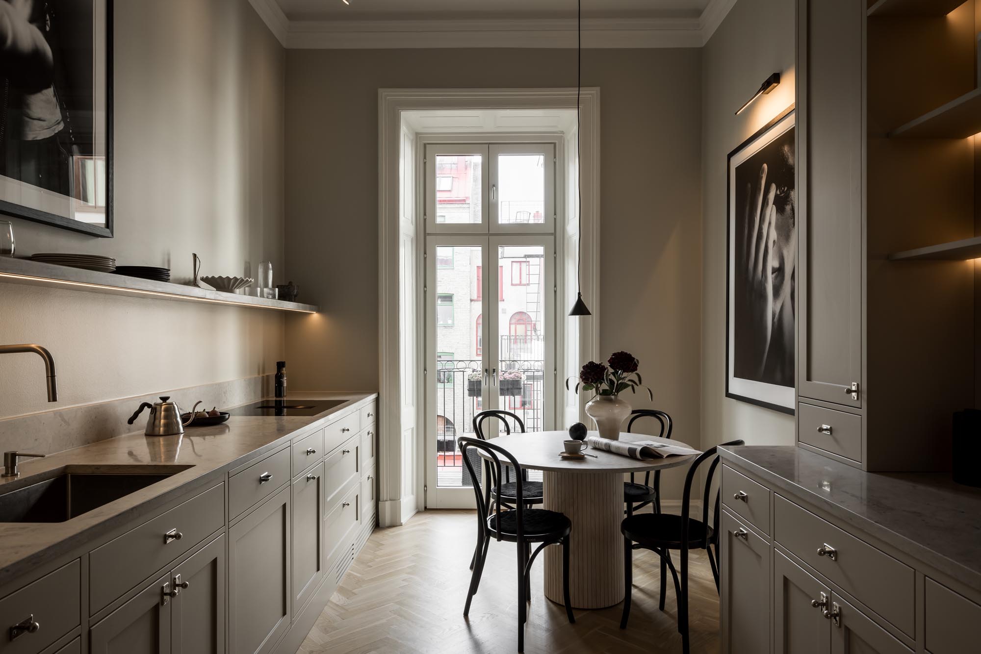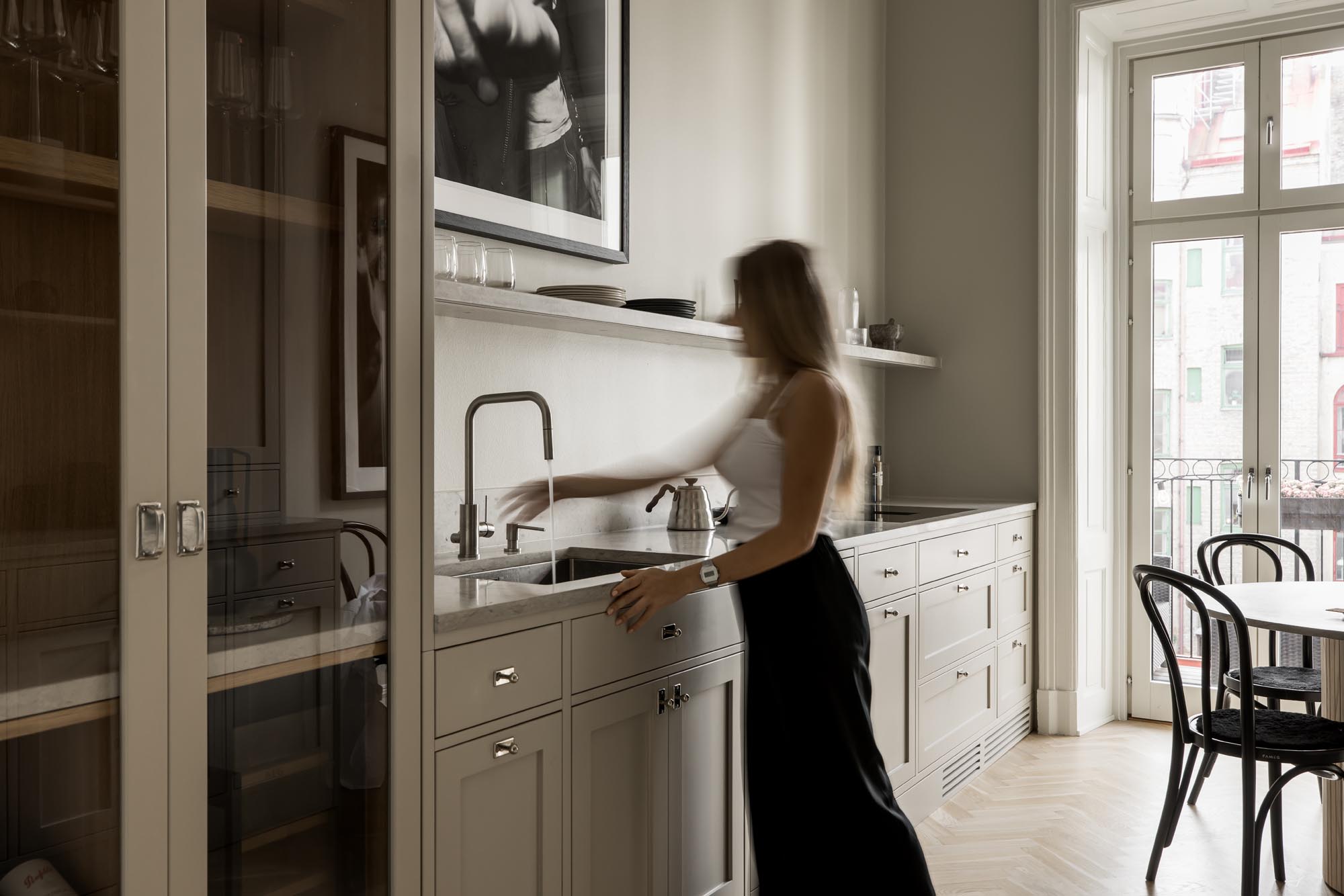 This project combines a timeless Shaker kitchen with the classic turn-of-the-century character of the building from 1875, located in central Gothenburg. With respect for the historical details, such as well-preserved ceiling stucco, we created a harmonious whole where the modern meets the traditional. The kitchen is designed to be both functional and aesthetically pleasing, with a focus on sustainable materials and sophisticated lighting.