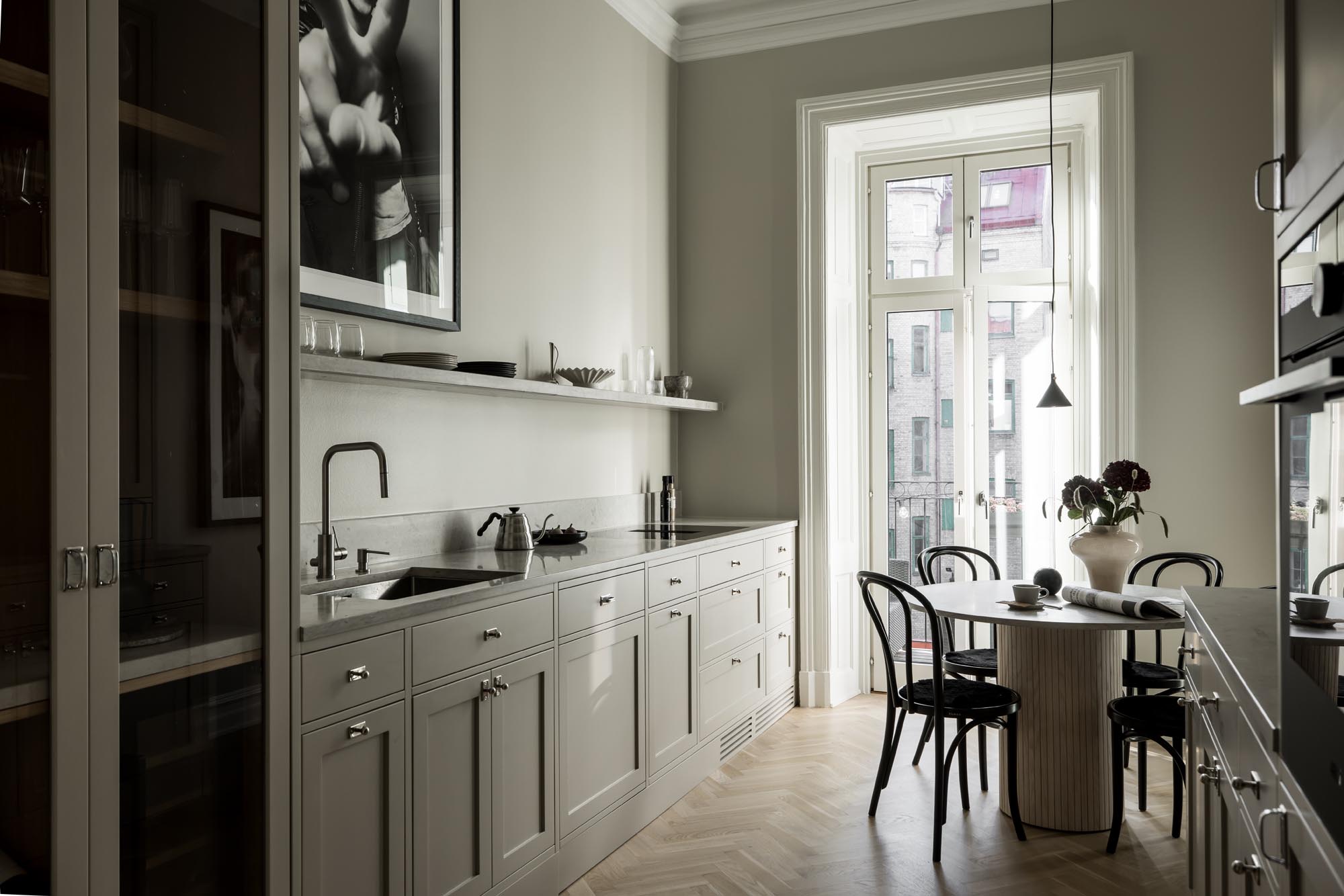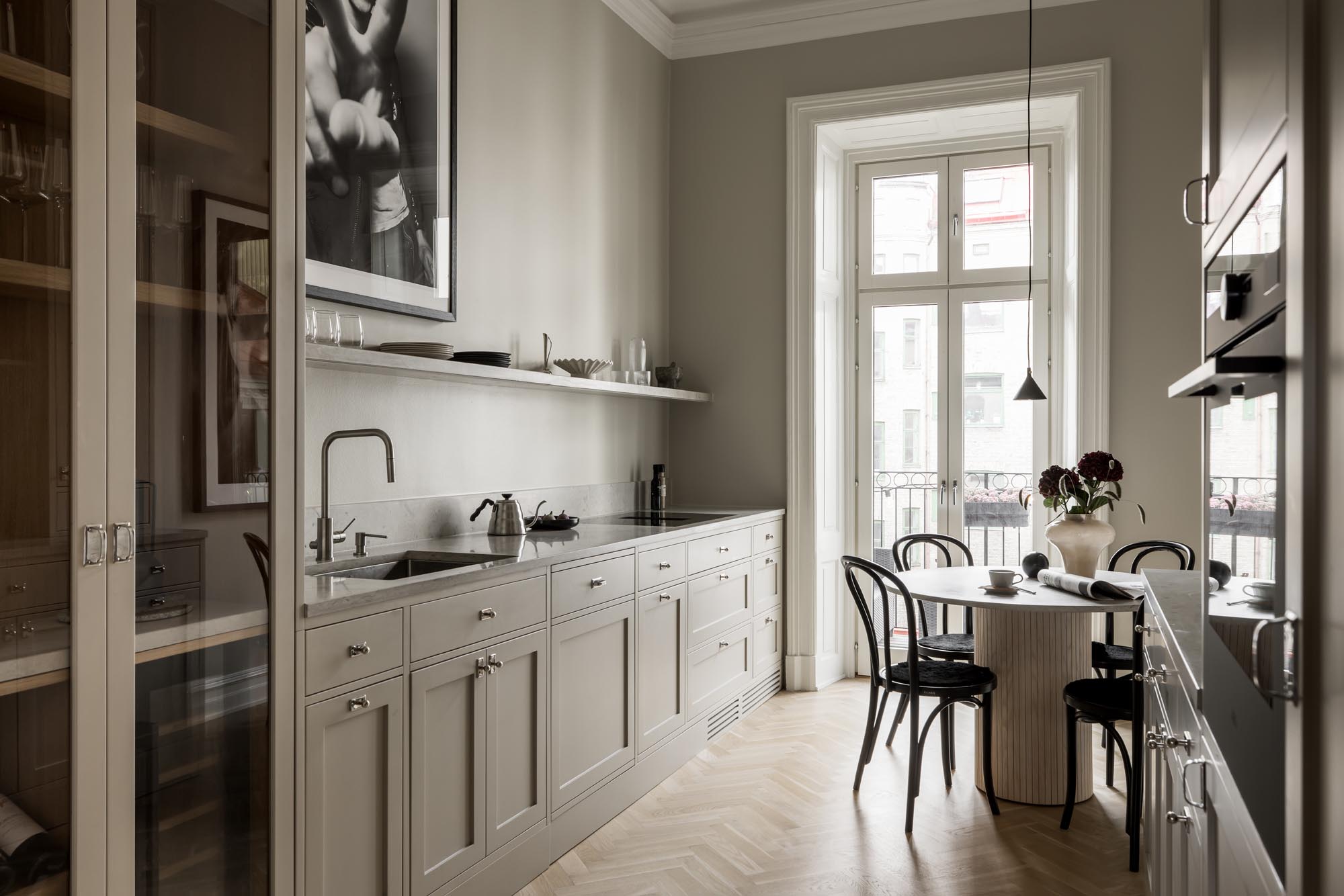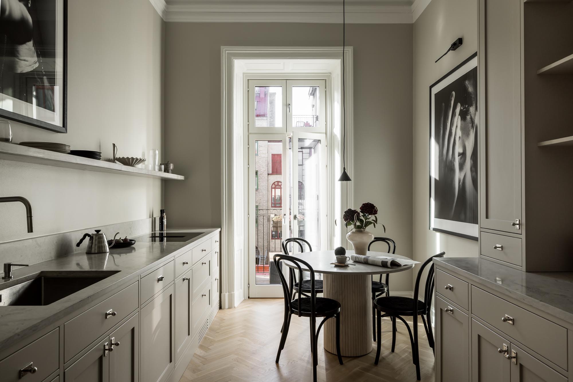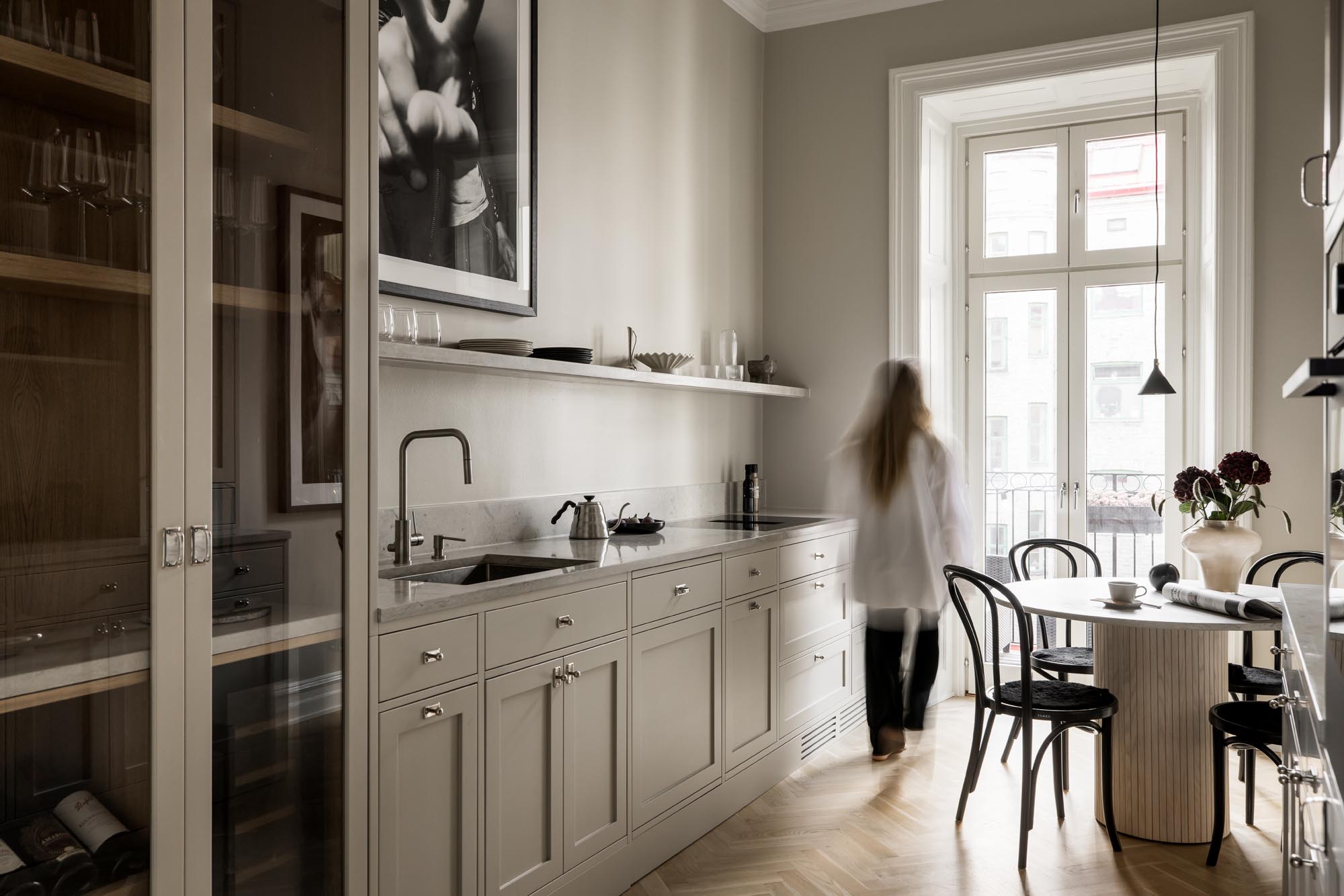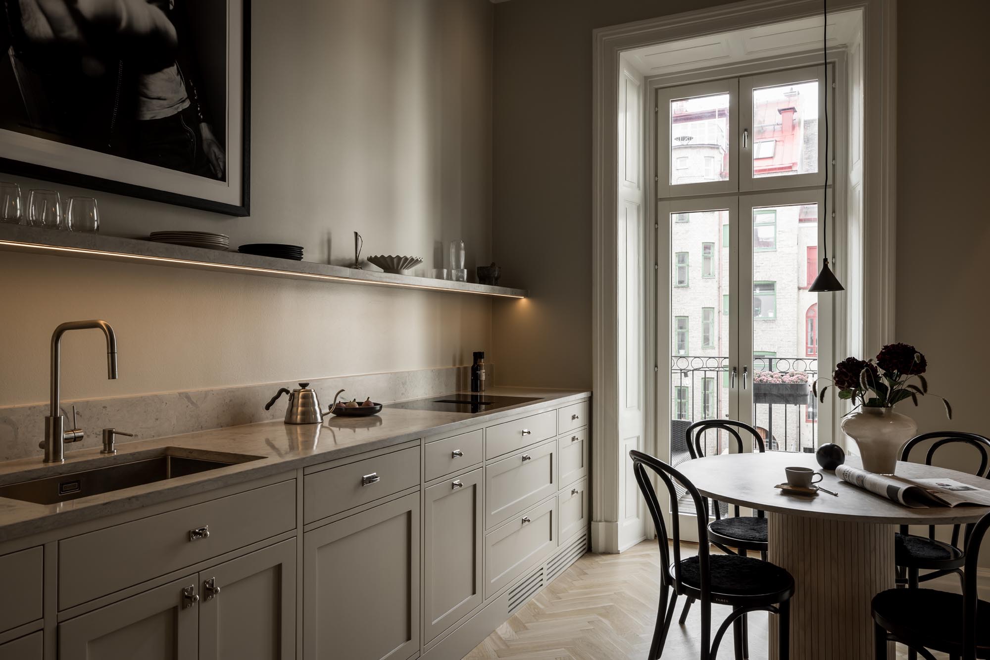 This project combines a timeless Shaker kitchen with the classic turn-of-the-century character of the building from 1875, located in central Gothenburg. With respect for the historical details, such as well-preserved ceiling stucco, we created a harmonious whole where the modern meets the traditional. The kitchen is designed to be both functional and aesthetically pleasing, with a focus on sustainable materials and sophisticated lighting.