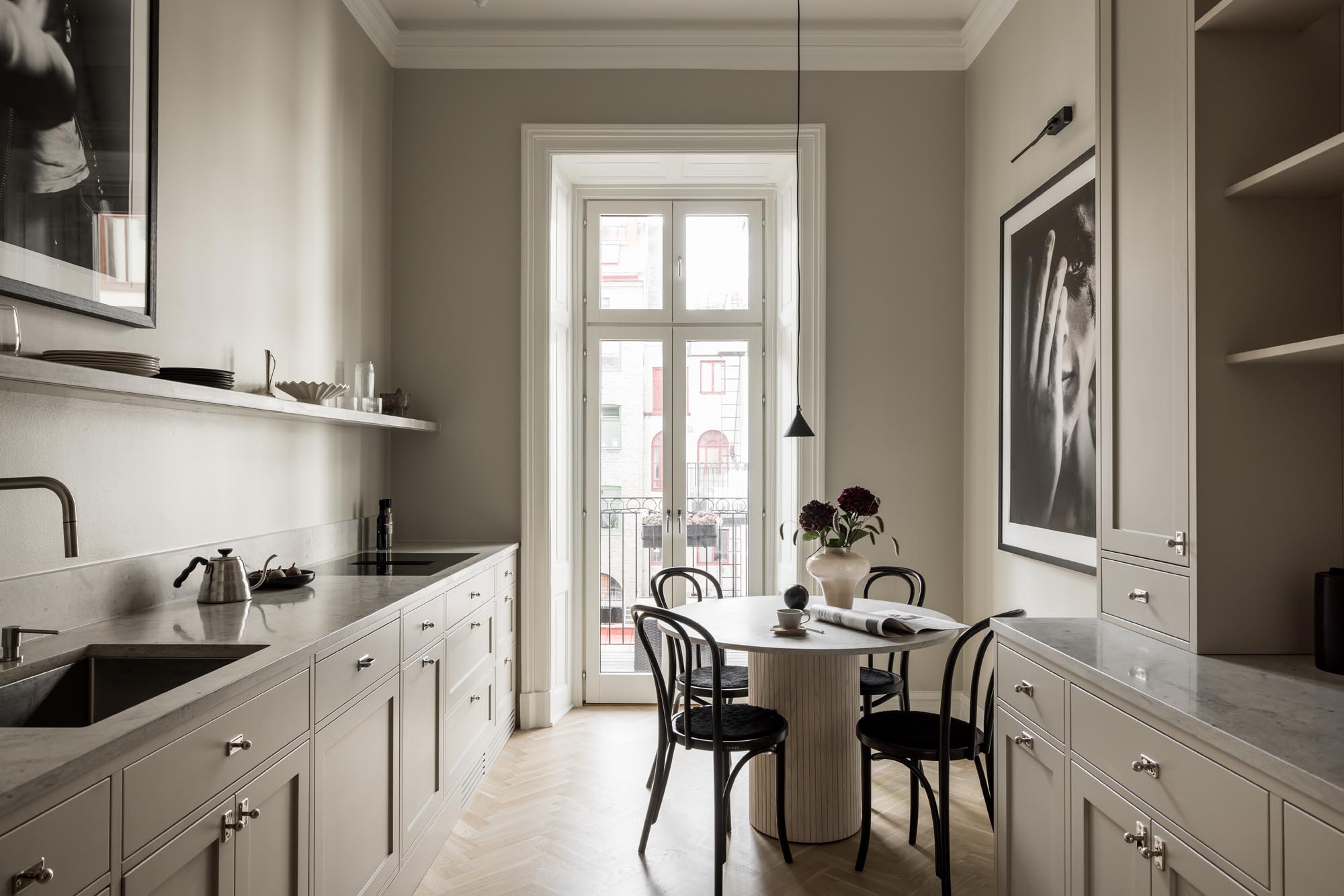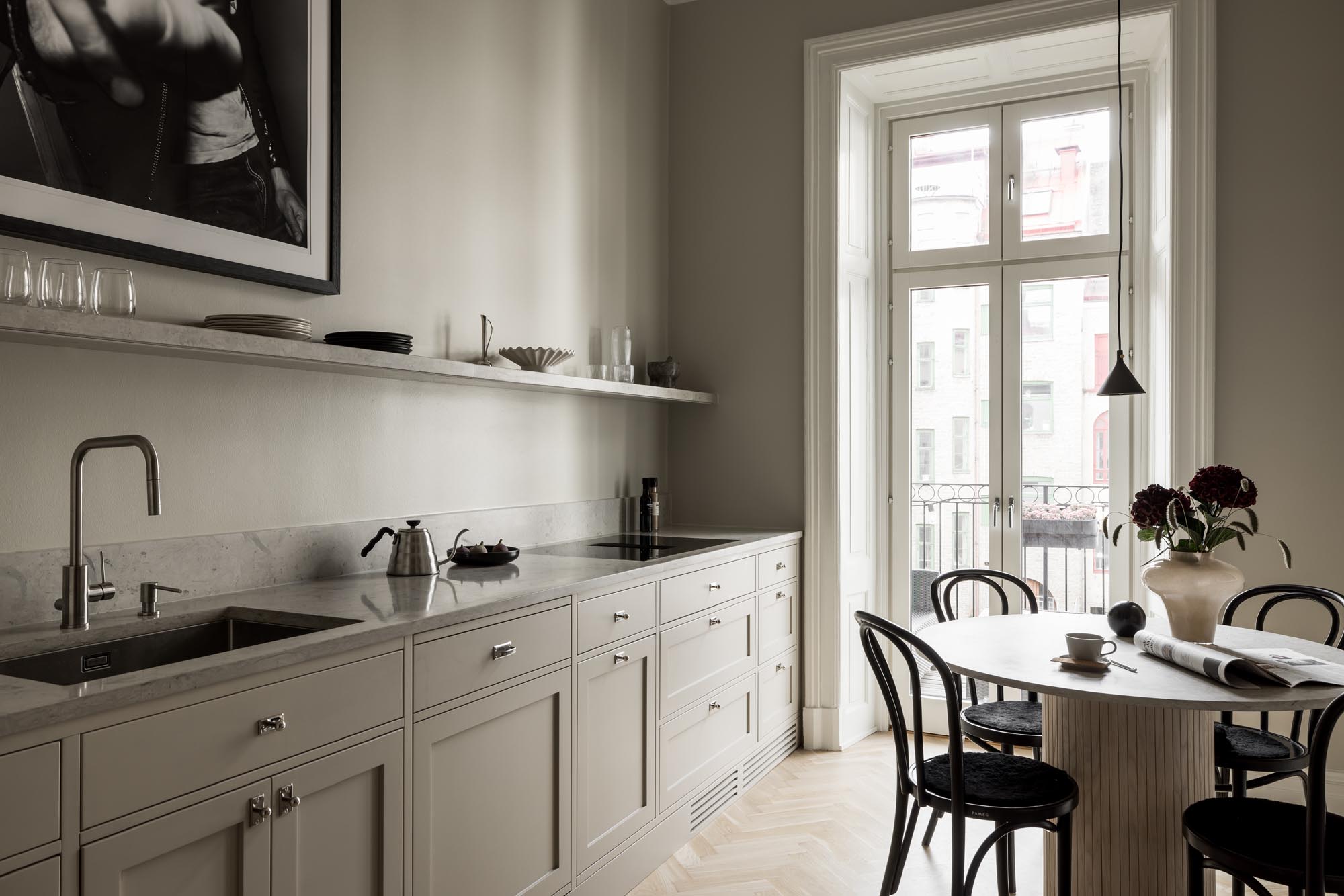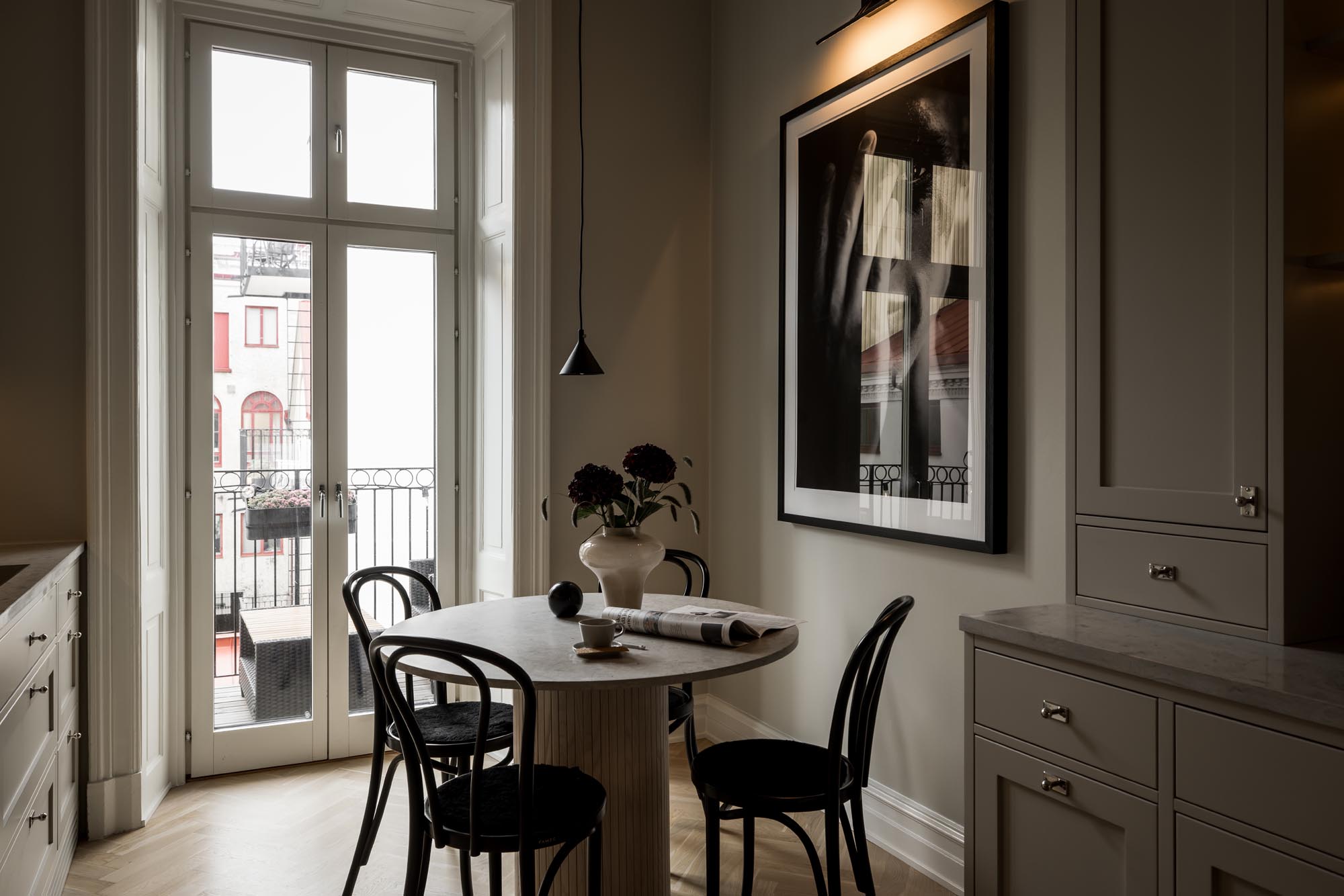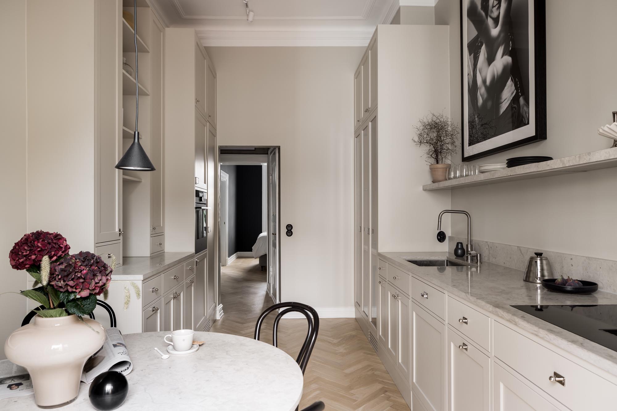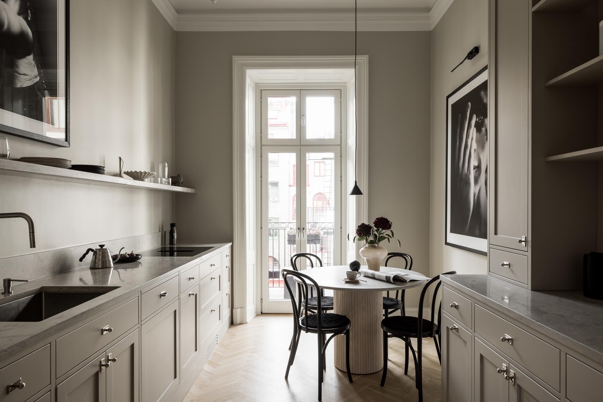 This project combines a timeless Shaker kitchen with the classic turn-of-the-century character of the building from 1875, located in central Gothenburg. With respect for the historical details, such as well-preserved ceiling stucco, we created a harmonious whole where the modern meets the traditional. The kitchen is designed to be both functional and aesthetically pleasing, with a focus on sustainable materials and sophisticated lighting.