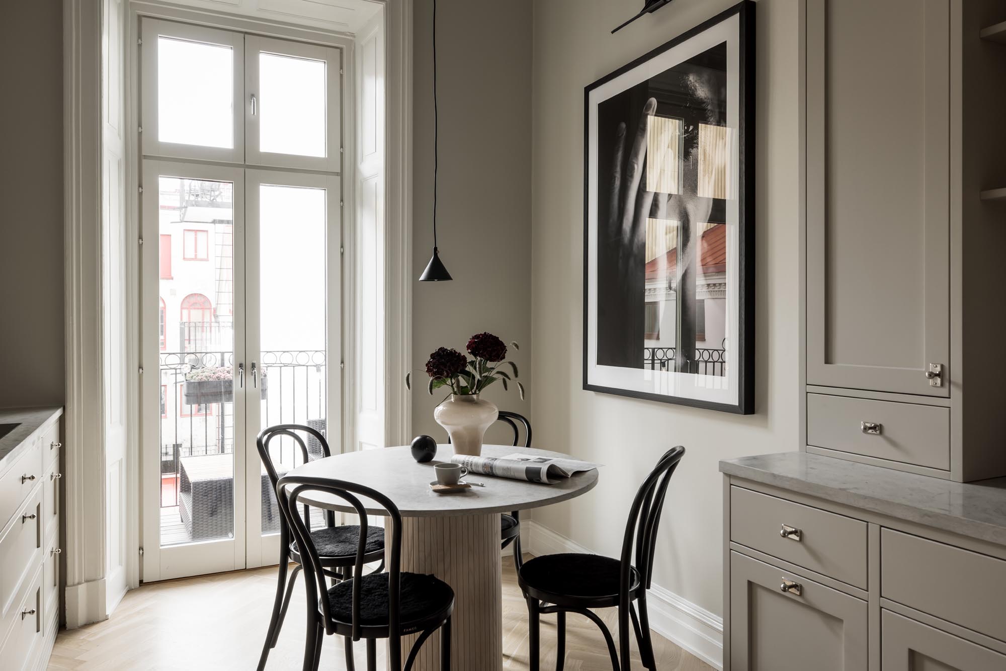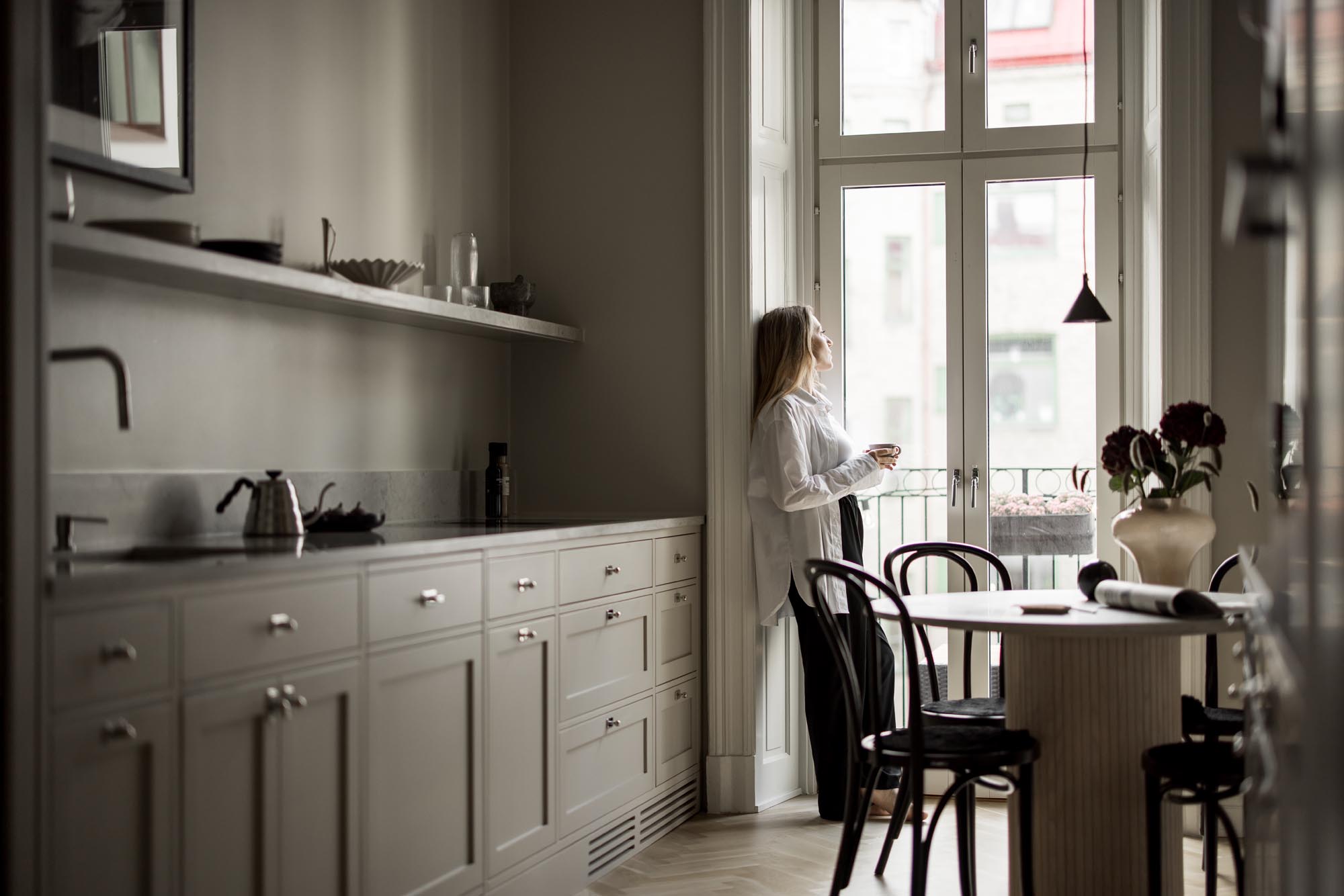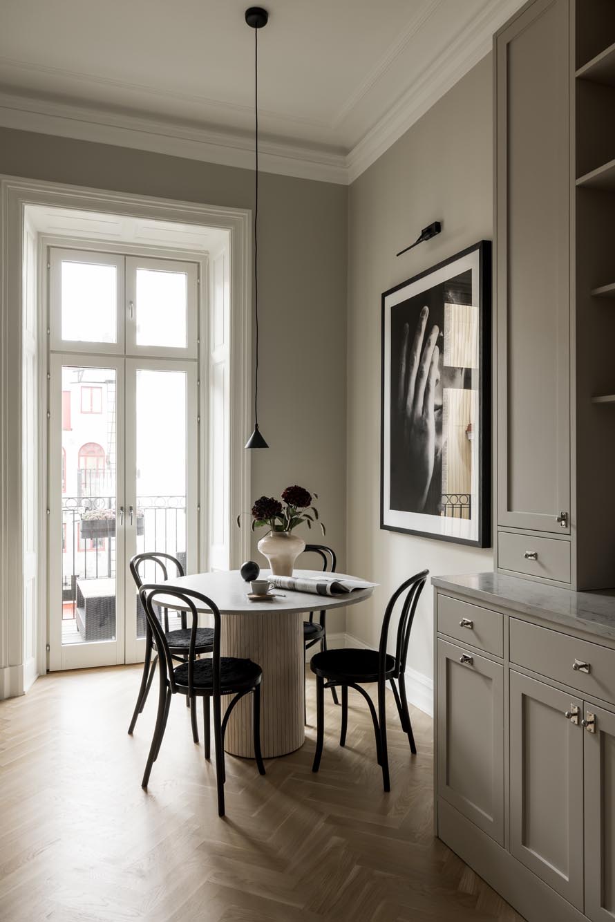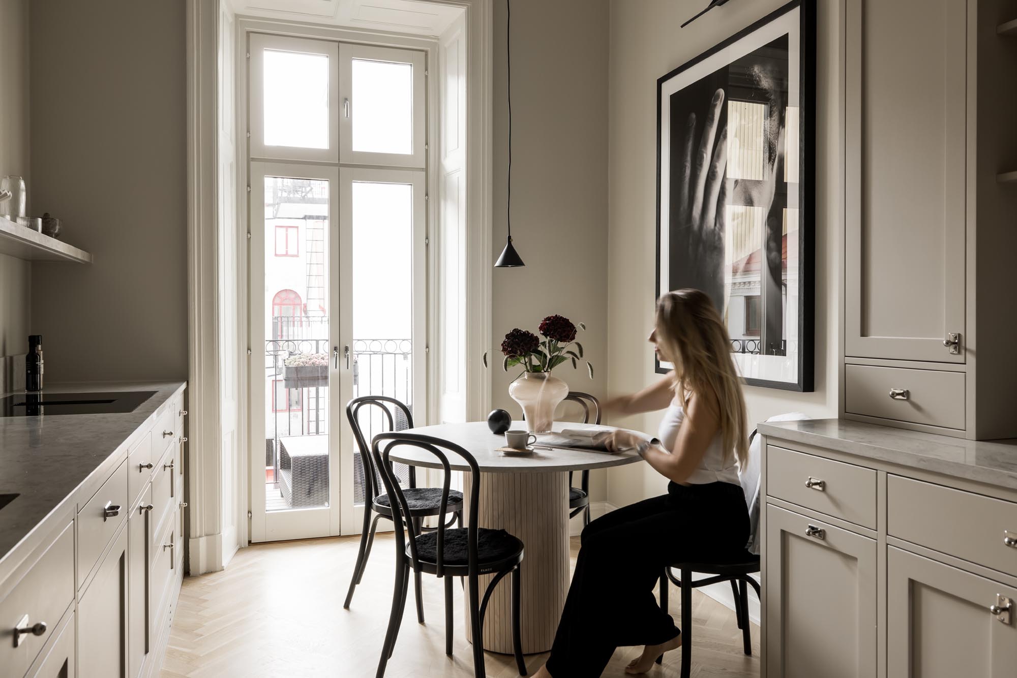 This project combines a timeless Shaker kitchen with the classic turn-of-the-century character of the building from 1875, located in central Gothenburg. With respect for the historical details, such as well-preserved ceiling stucco, we created a harmonious whole where the modern meets the traditional. The kitchen is designed to be both functional and aesthetically pleasing, with a focus on sustainable materials and sophisticated lighting.