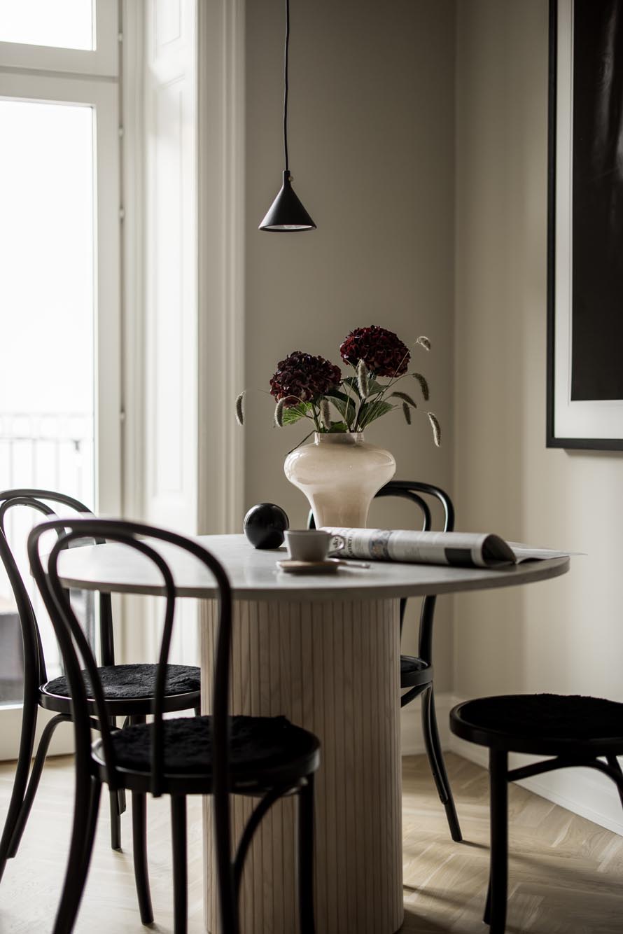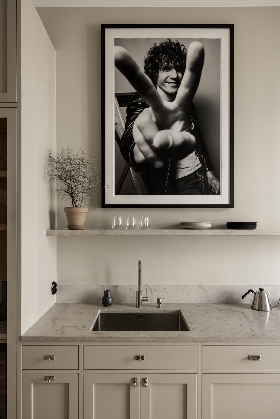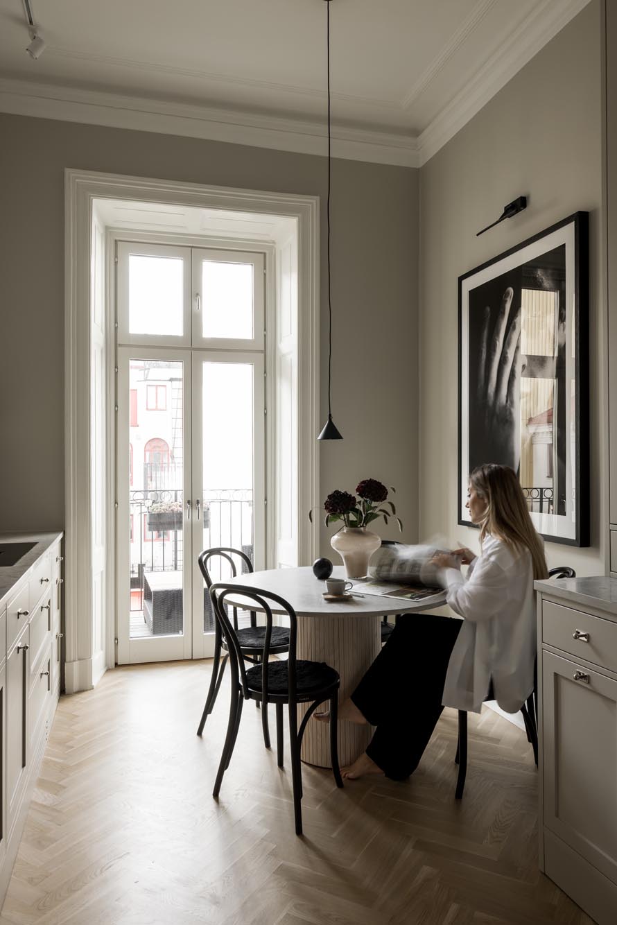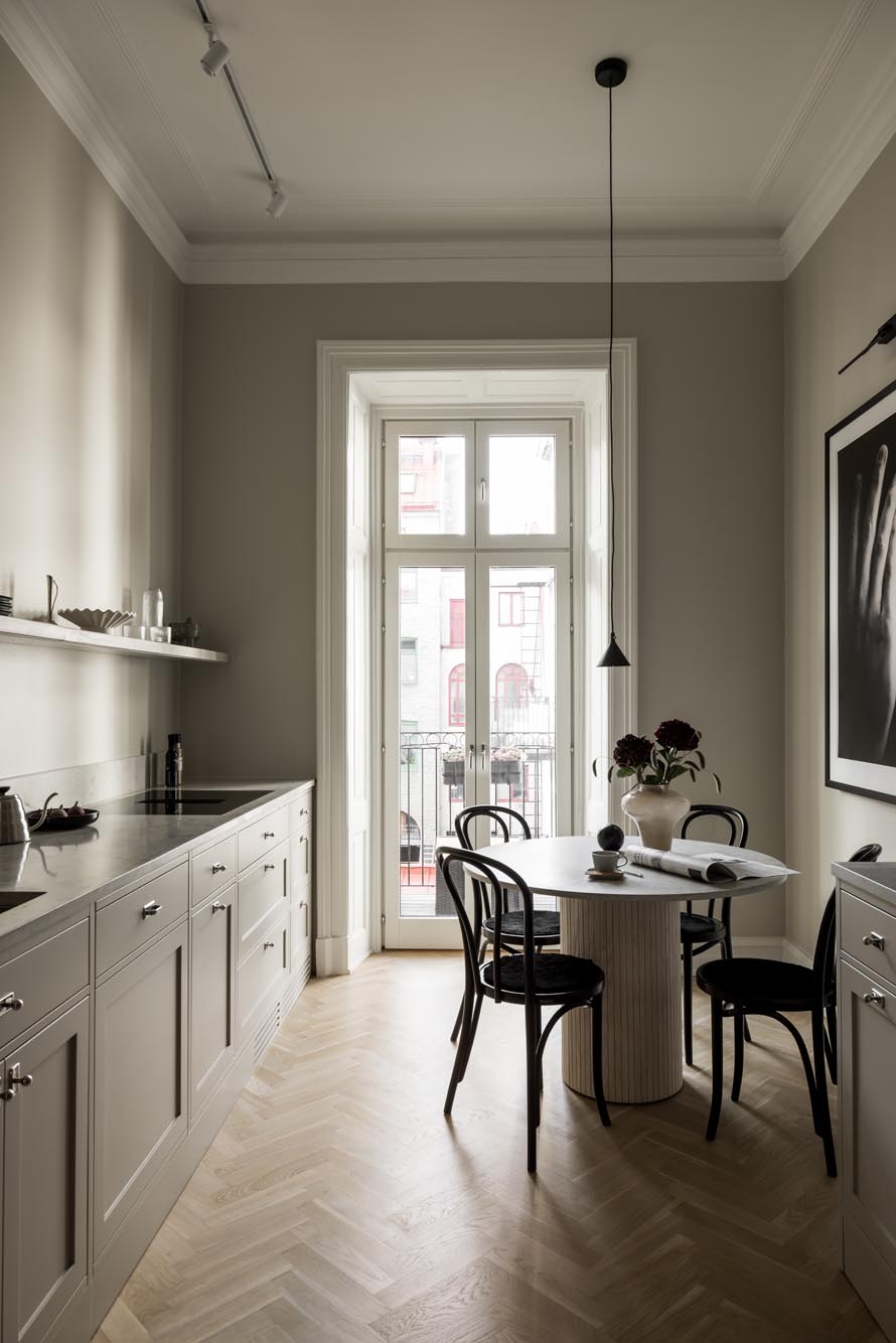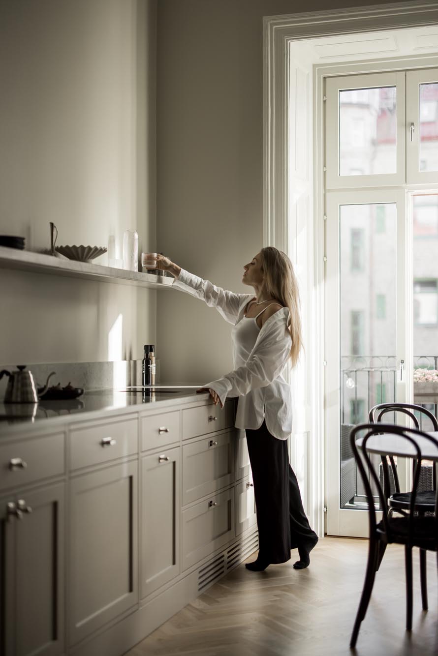 This project combines a timeless Shaker kitchen with the classic turn-of-the-century character of the building from 1875, located in central Gothenburg. With respect for the historical details, such as well-preserved ceiling stucco, we created a harmonious whole where the modern meets the traditional. The kitchen is designed to be both functional and aesthetically pleasing, with a focus on sustainable materials and sophisticated lighting.