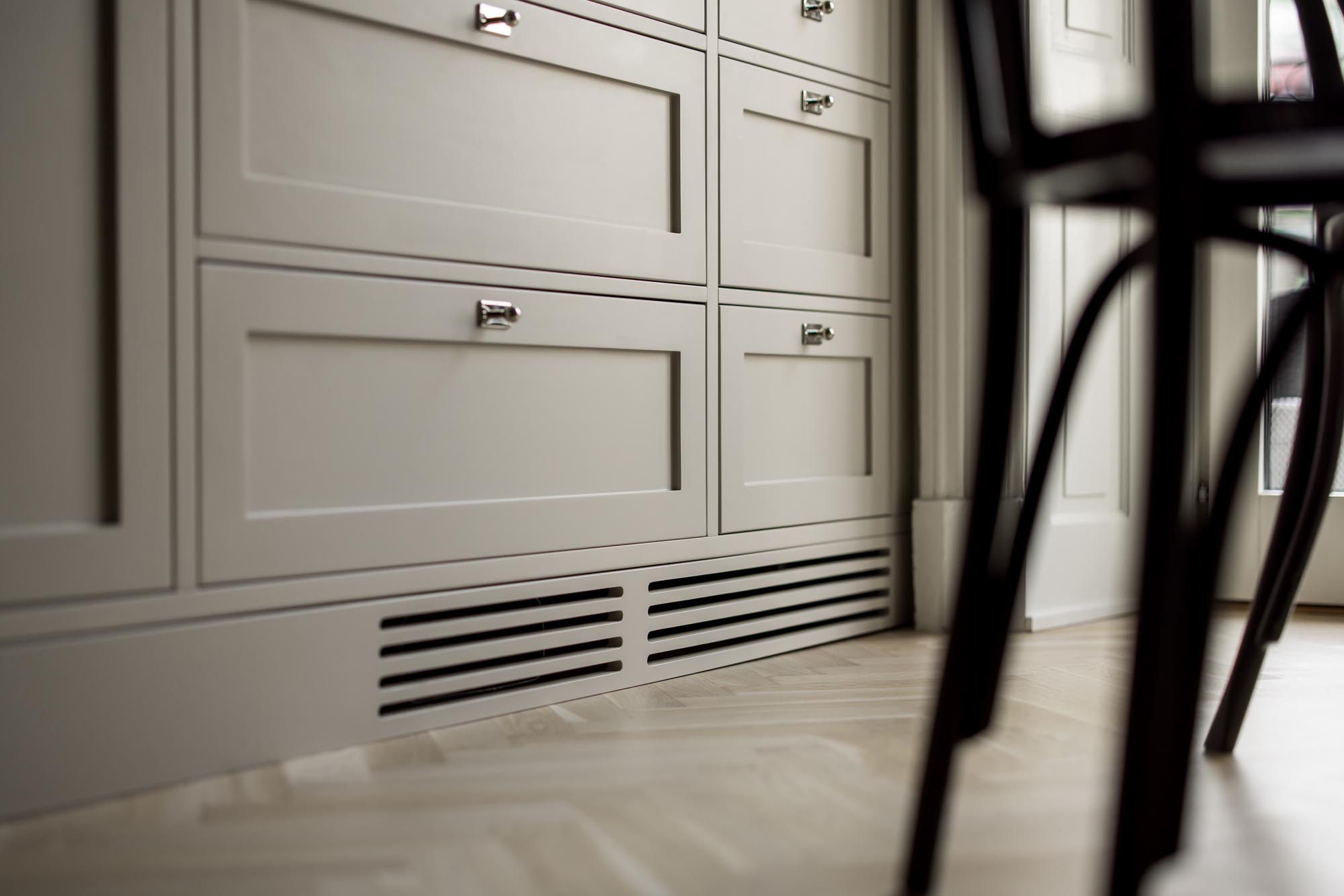 In addition, we chose to keep the cabinets below ceiling height to leave room for original ceiling stucco. In this way, the sense of space and respect for the history of the building is enhanced.