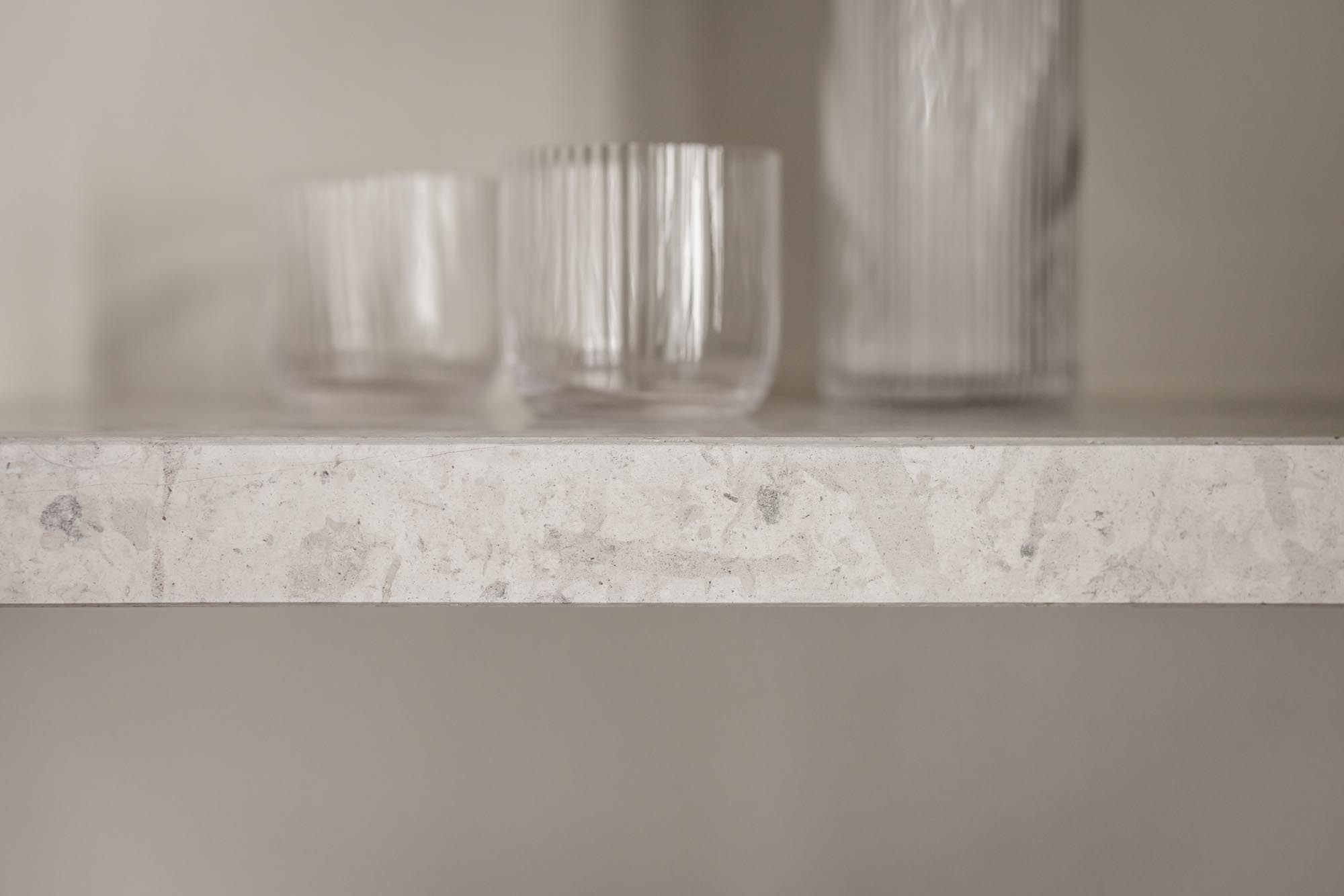 Lighting: Integrated in the back of open shelves and in the stone shelf