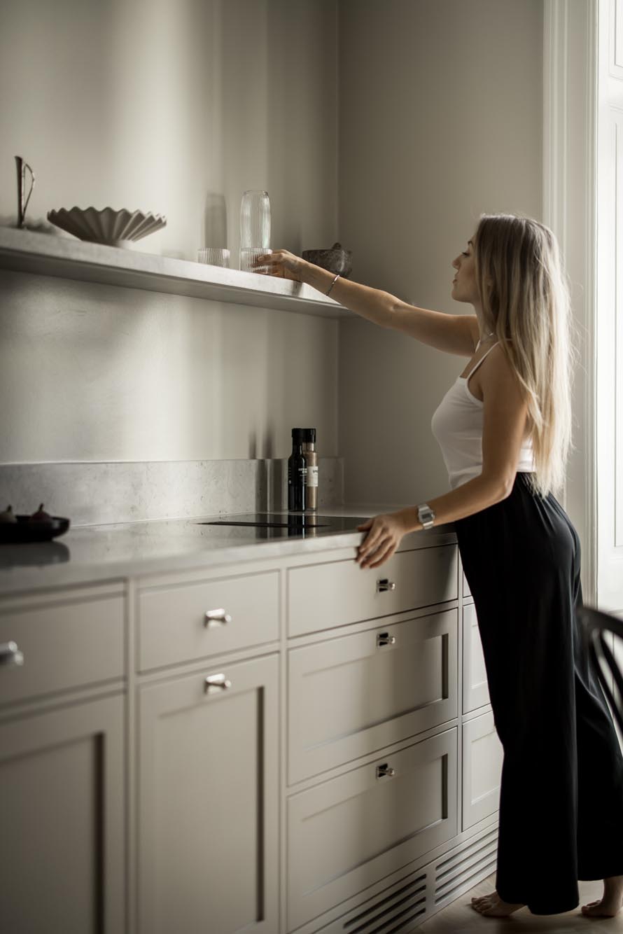 The open shelves and cabinets are clad in oak veneer, which adds warmth and contrast to the otherwise light kitchen. We’ve also worked with details like knobs to enhance the classic feel.
