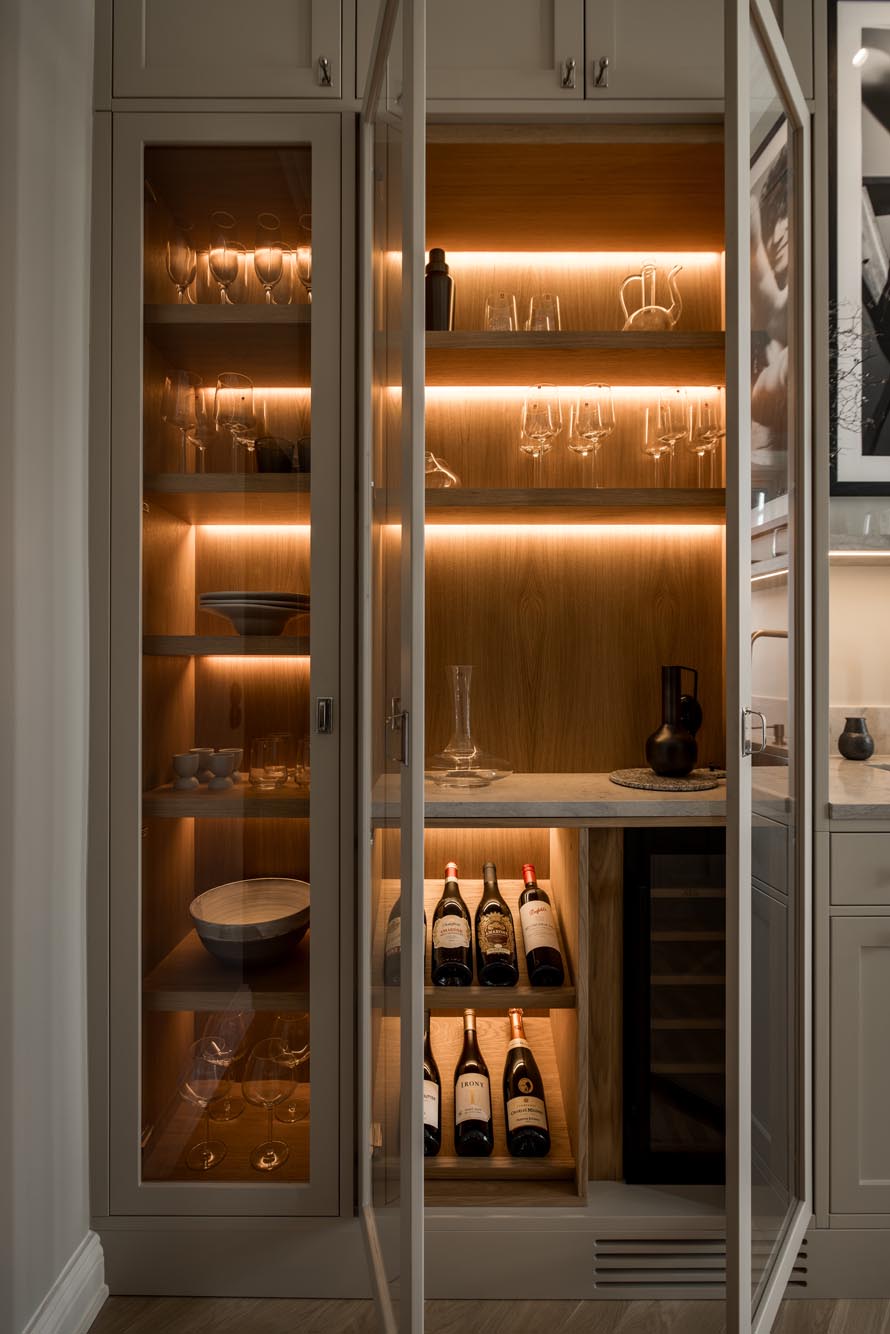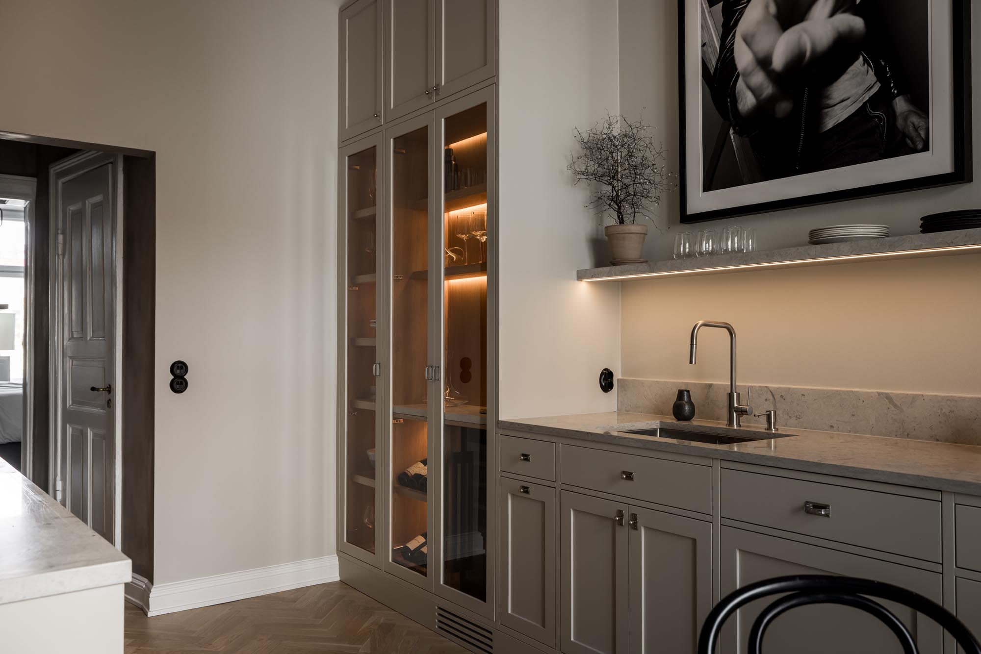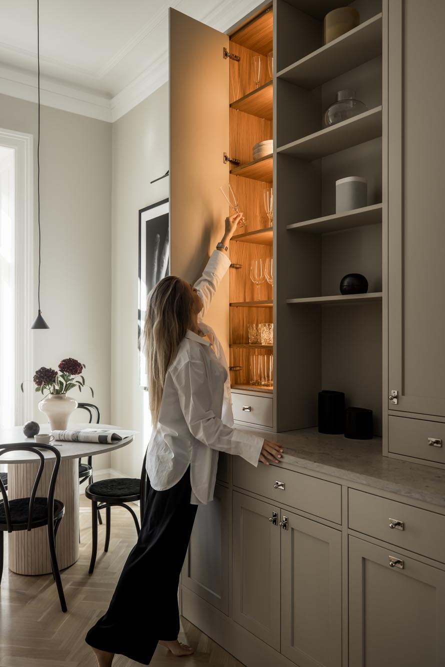 This kitchen is designed with several hidden features and thoughtful solutions. As there is a chimney protruding from the wall, we created a tailor-made placement of the glass cabinets to integrate them with the structure of the room. Where the chimney ends, we were also able to fit a wine fridge.
