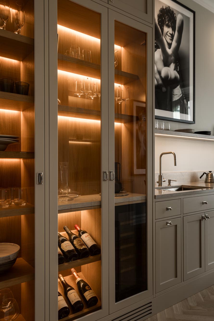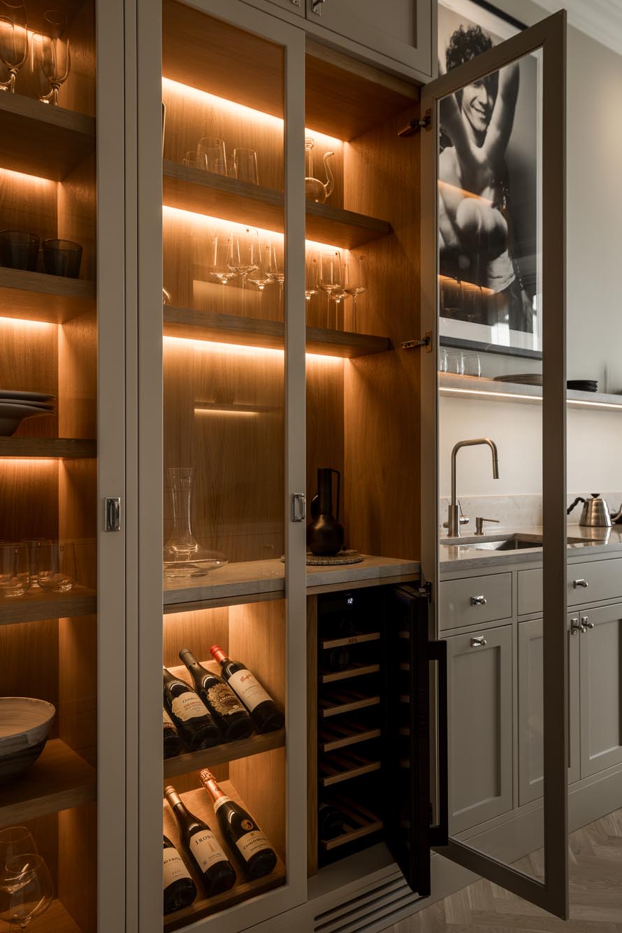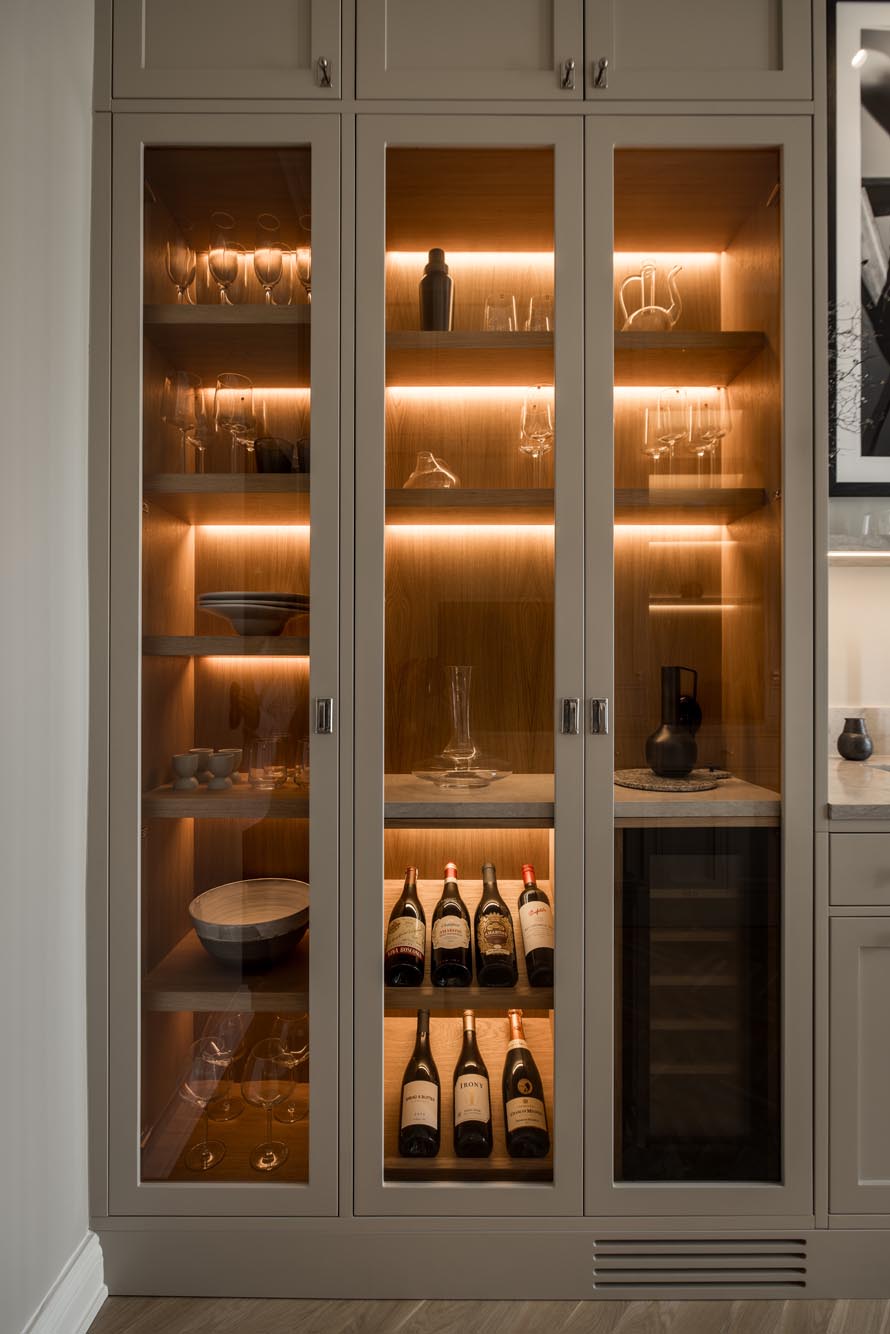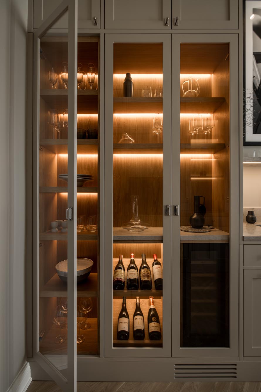 This kitchen is designed with several hidden features and thoughtful solutions. As there is a chimney protruding from the wall, we created a tailor-made placement of the glass cabinets to integrate them with the structure of the room. Where the chimney ends, we were also able to fit a wine fridge.