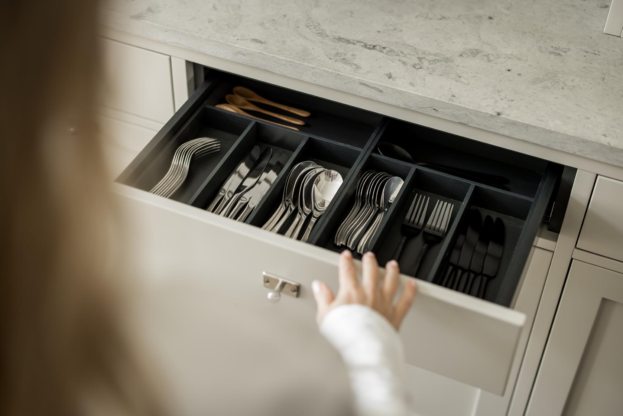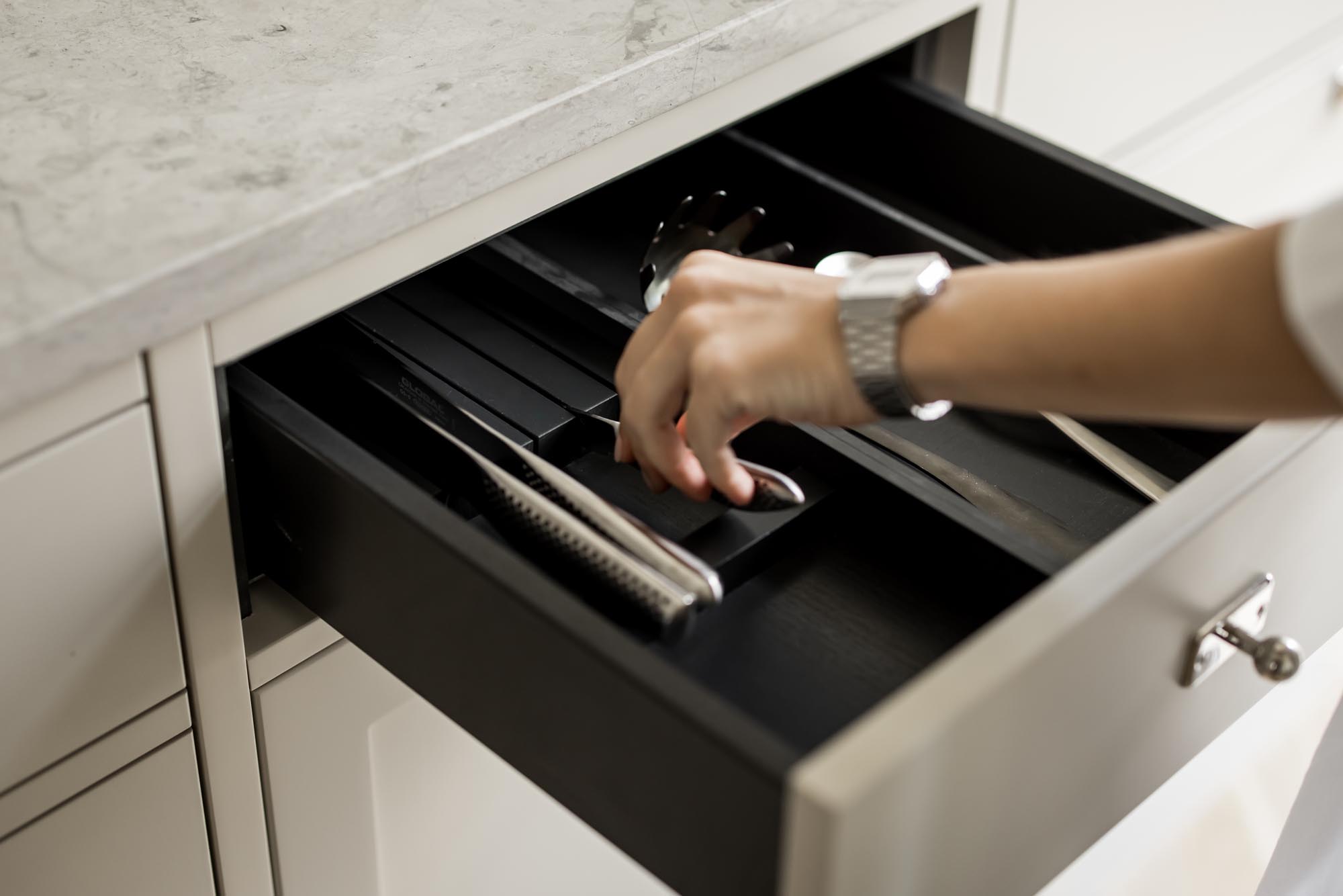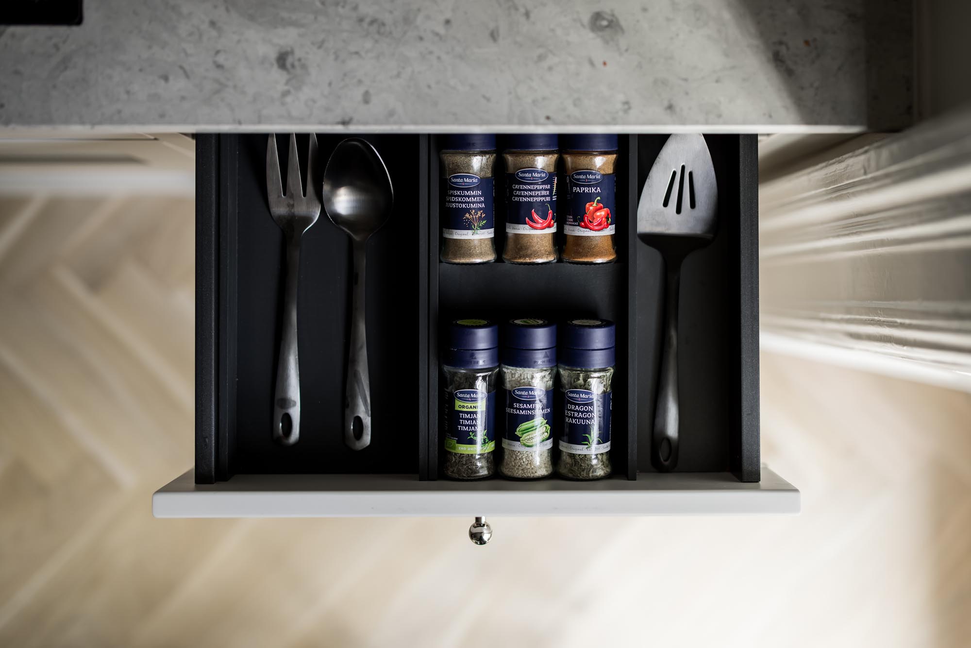Beyond aesthetics, we have focused on creating a kitchen with smart solutions. The drawer divisions are optimized for storing cutlery and kitchen utensils, and the tailor-made storage makes it easy to keep things tidy. Every detail is designed to make everyday life both easier and more inspiring.
