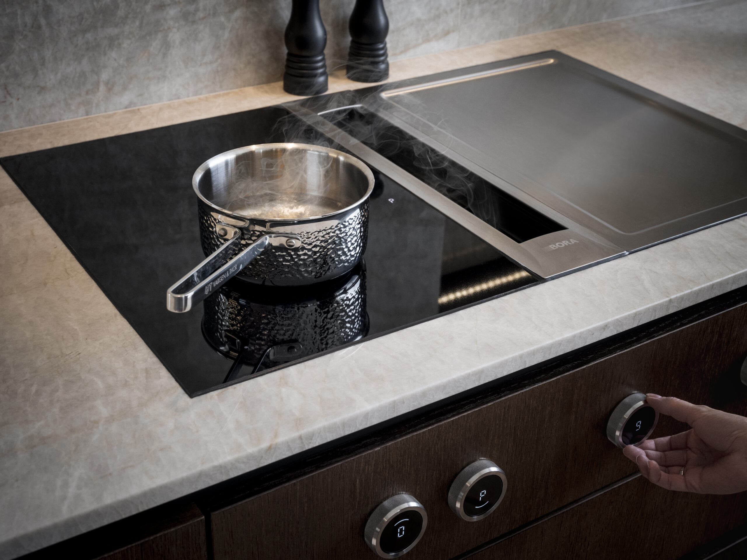 At an early stage, the customer decided to have a downdraft fan integrated into the induction hob. Something that has become a bit of a standard with our customers and what we see has become an increasingly common part of modern kitchens. In this case, it was a Bora professional 3.0 with a frying plate (Teppan Yaki) and knobs mounted in a drawer front. By placing the knob at the front, you get a larger surface on the hob. An exclusive detail in a modern kitchen. We often get the question and downdraft fans are good when steam rises. The answer is, YES, they work great. In a kitchen island they are usually the best option. The drawers in front of the hob are planned in detail to maximize the interior design based on the customer’s needs.