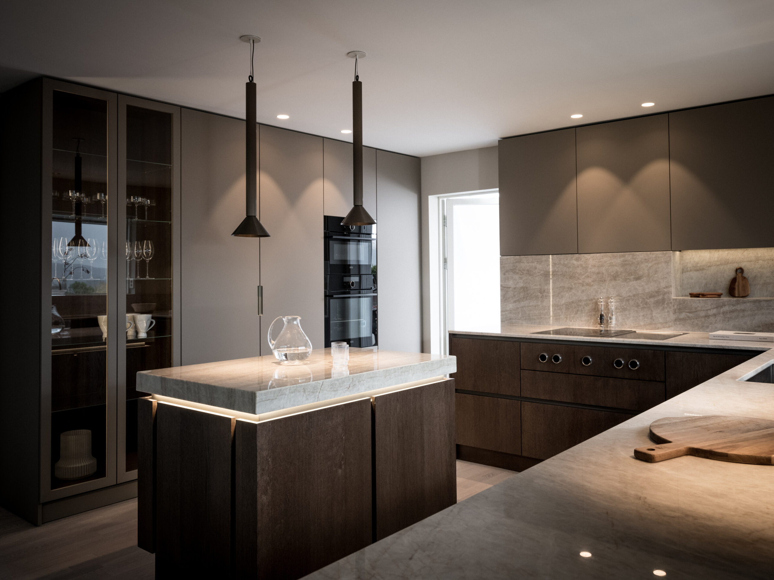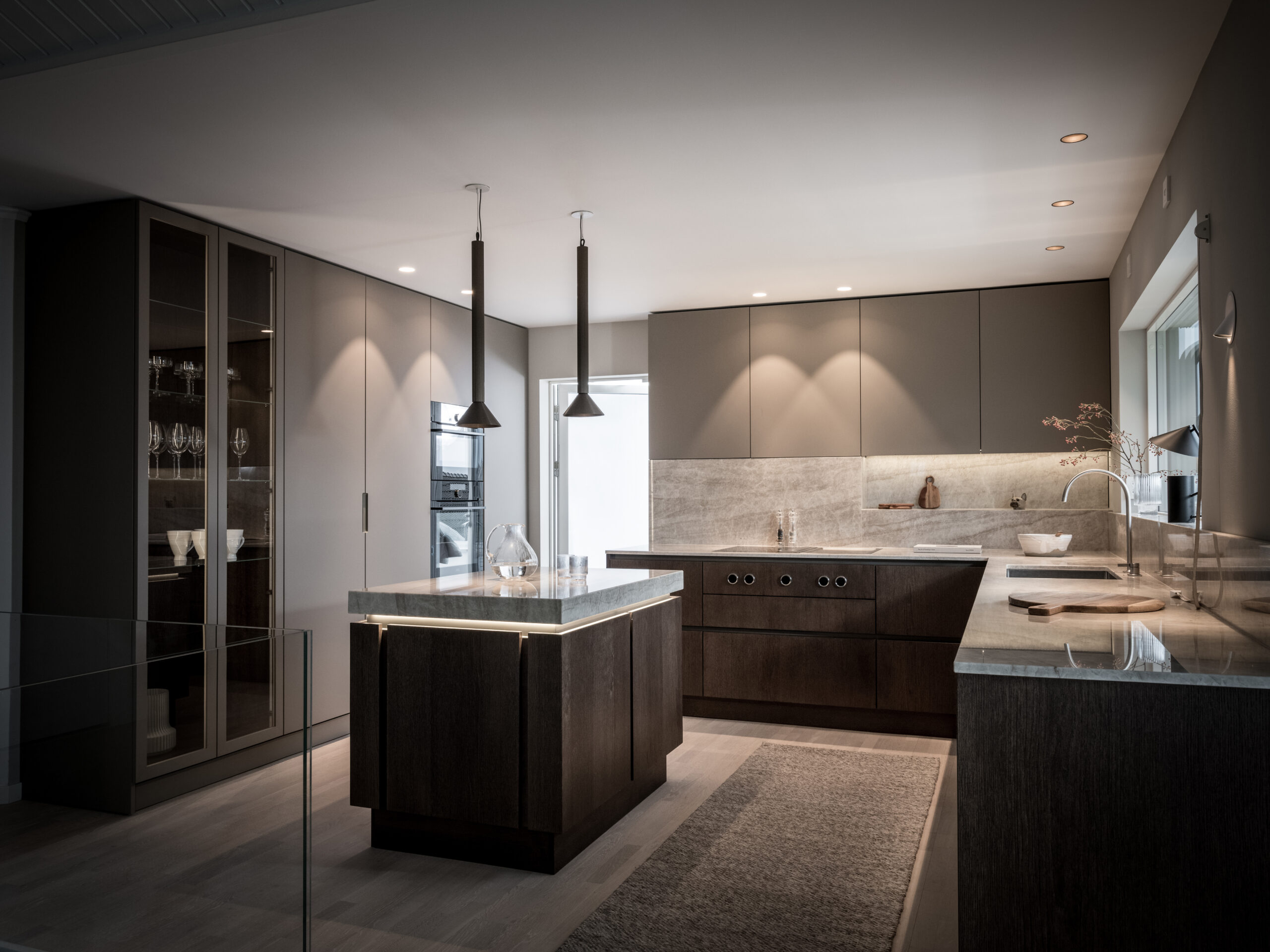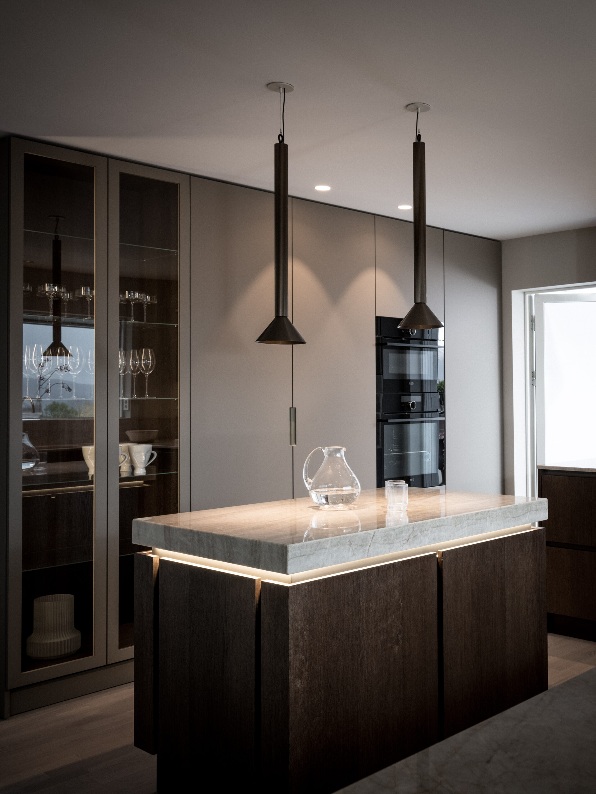 The island that has also been called “the jewelry”. As the client had a kitchen island in the previous kitchen that was not used much, the idea from the beginning was to perhaps exclude it completely. It would create a very large unused area that made it feel empty. Hence the idea of the “jewel”, which became the working name of the new kitchen island. It would demonstrate craftsmanship and create a beautiful focal point. At the same time, it would also provide functional storage for crockery. The countertop of the kitchen island, made of Taj Mahal quartzite, gives the impression of a solid piece of stone and becomes a beautiful detail. The straight-edged doors are mounted on extra-deep drawers. The doors are made of 1.5mm thick, quartersawn oak veneer. The pigmentation is a black-brown stain finished with a matte lacquer. A beautiful detail is that the doors are pattern-matched. Something we do in most projects. The aluminum profiles are milled into the frames, which gives a handleless design. It also allows an LED profile to be mounted under the worktop. In the evening it gives a beautiful effect together with the ceiling pendants. The aluminum profiles can be powder coated in any RAL and also different gloss levels.