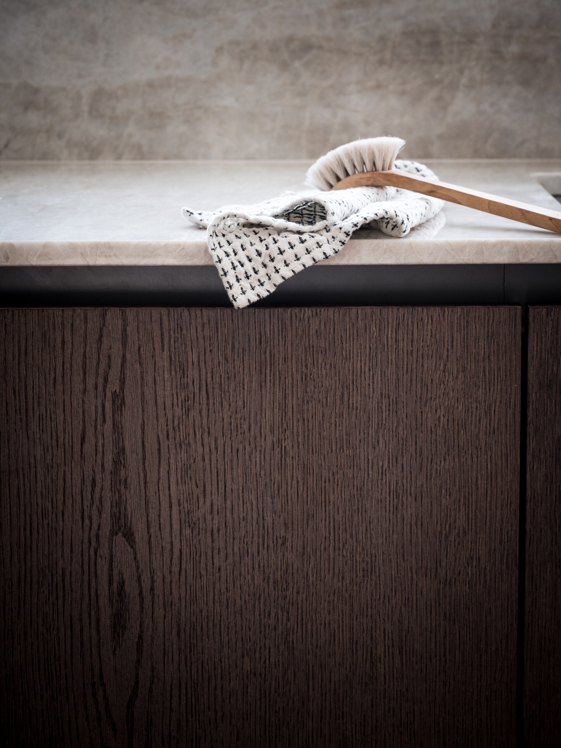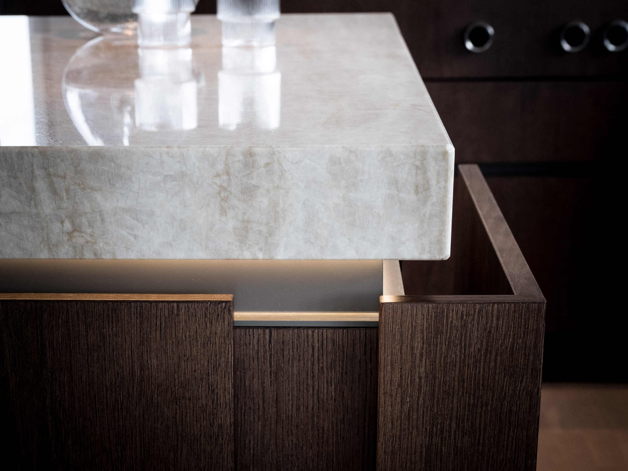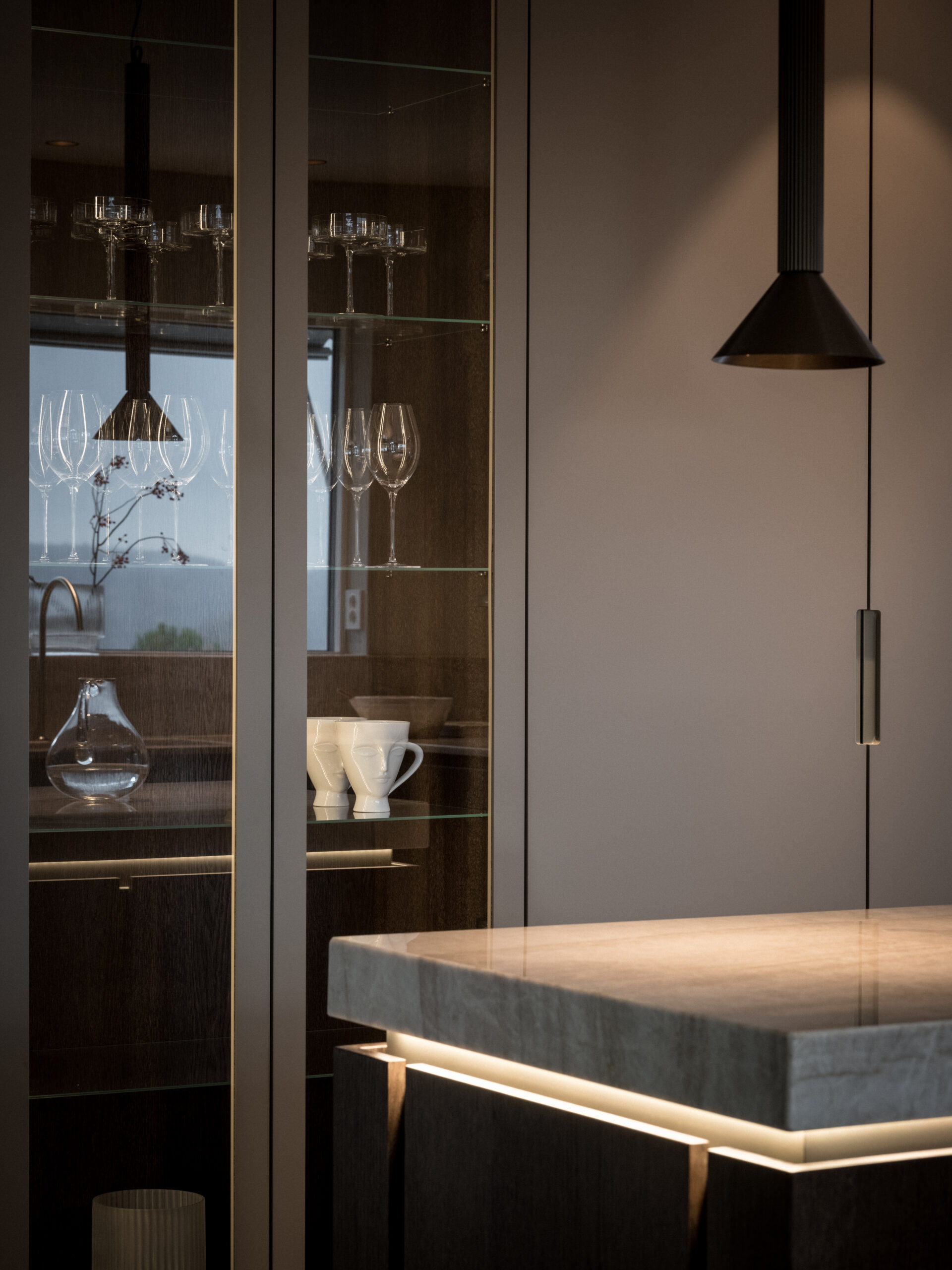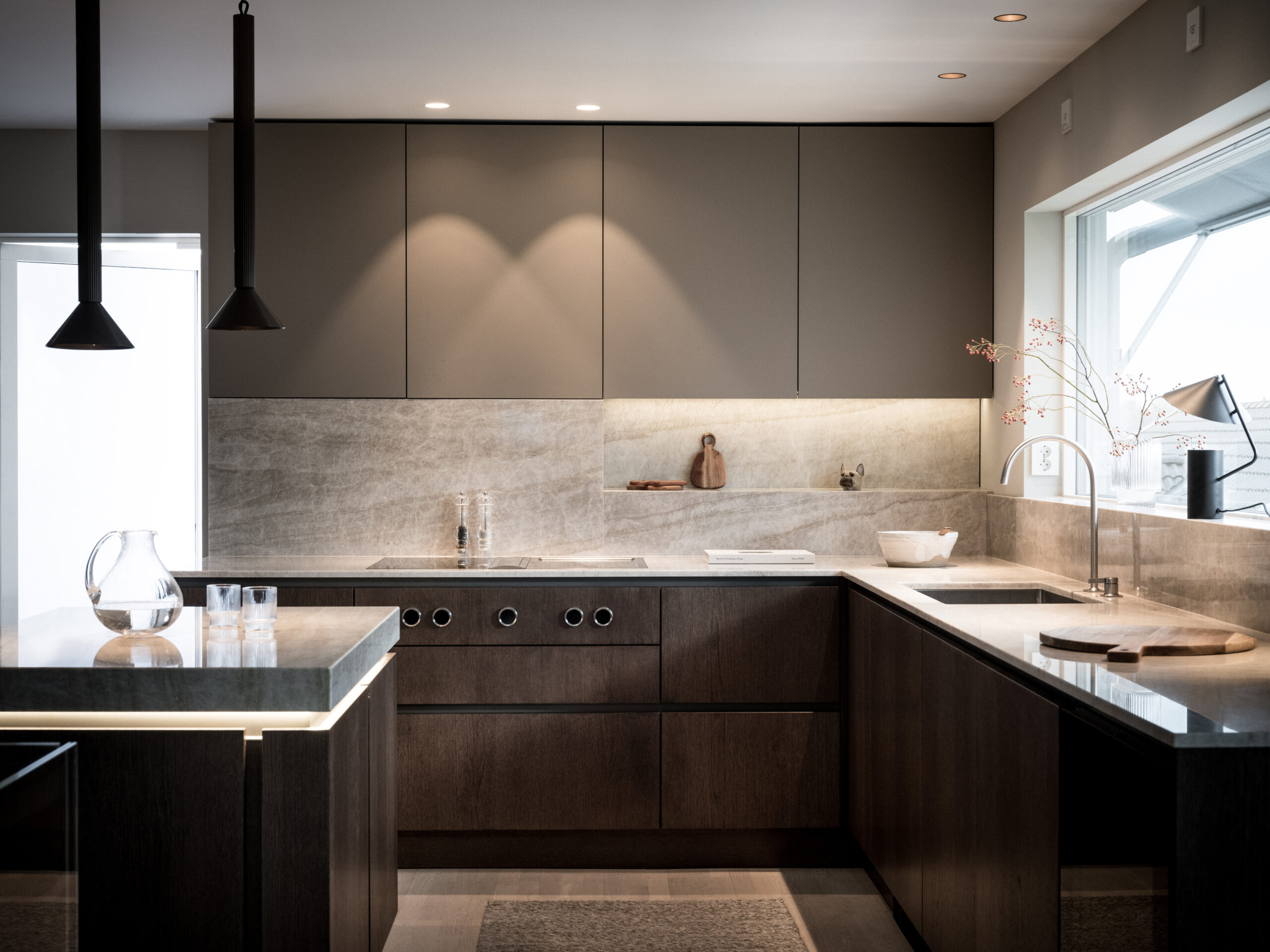 The island that has also been called “the jewelry”. As the client had a kitchen island in the previous kitchen that was not used much, the idea from the beginning was to perhaps exclude it completely. It would create a very large unused area that made it feel empty. Hence the idea of the “jewel”, which became the working name of the new kitchen island. It would demonstrate craftsmanship and create a beautiful focal point. At the same time, it would also provide functional storage for crockery. The countertop of the kitchen island, made of Taj Mahal quartzite, gives the impression of a solid piece of stone and becomes a beautiful detail. The straight-edged doors are mounted on extra-deep drawers. The doors are made of 1.5mm thick, quartersawn oak veneer. The pigmentation is a black-brown stain finished with a matte lacquer. A beautiful detail is that the doors are pattern-matched. Something we do in most projects. The aluminum profiles are milled into the frames, which gives a handleless design. It also allows an LED profile to be mounted under the worktop. In the evening it gives a beautiful effect together with the ceiling pendants. The aluminum profiles can be powder coated in any RAL and also different gloss levels.