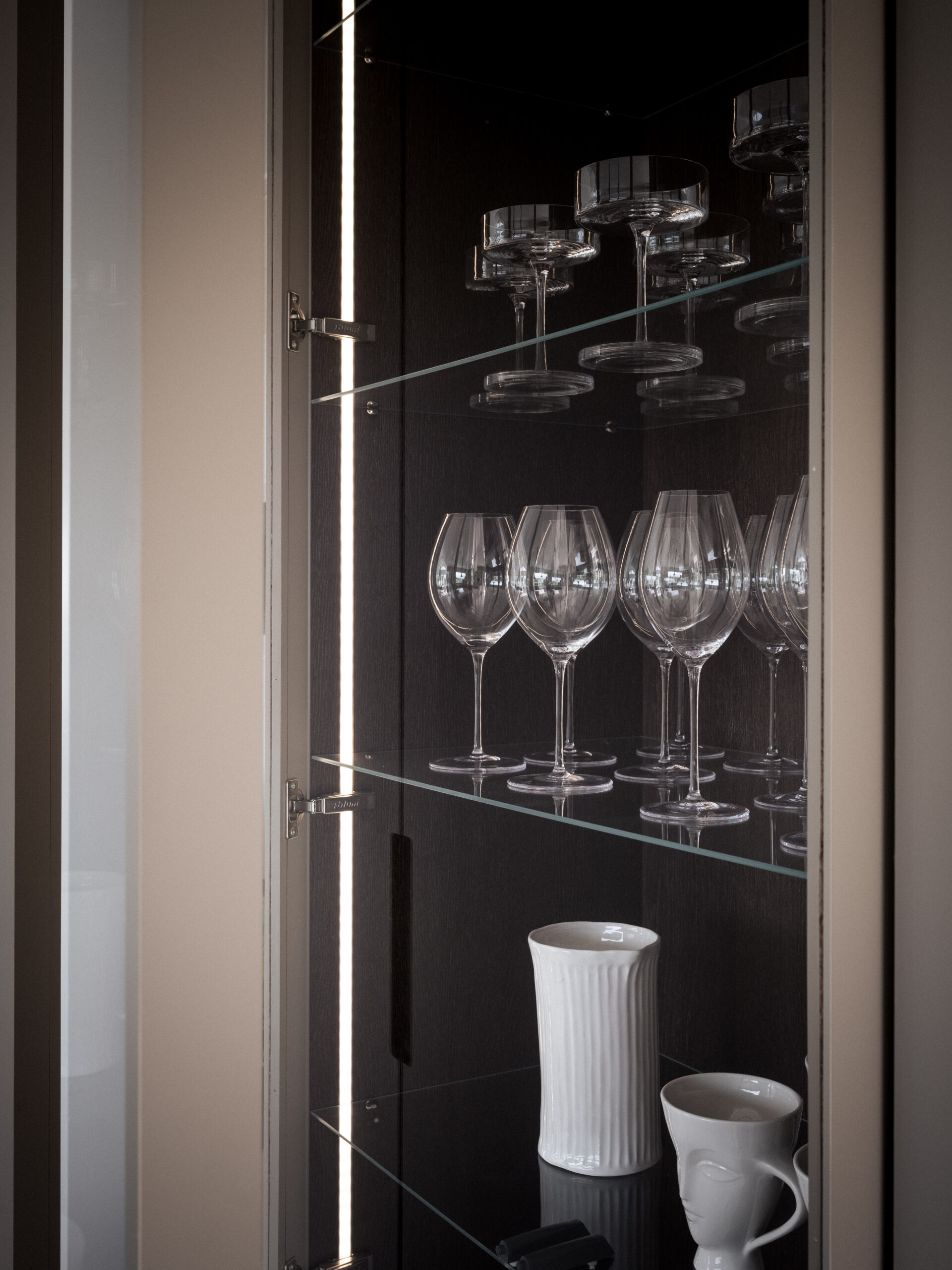 The wine fridge is strategically placed in the sense that we wanted it to take as little attention as possible. A nice detail is that we aligned the top of the wine fridge with the doors, which required some thought and adaptation.