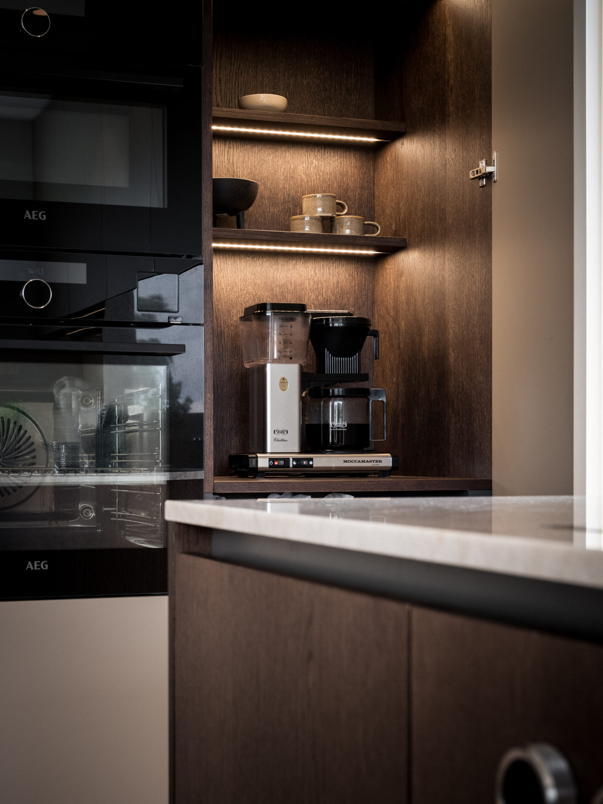 Grip solution: Handleless and push-to-open Lighting: On the sides of the coffee station and underneath the cabinets