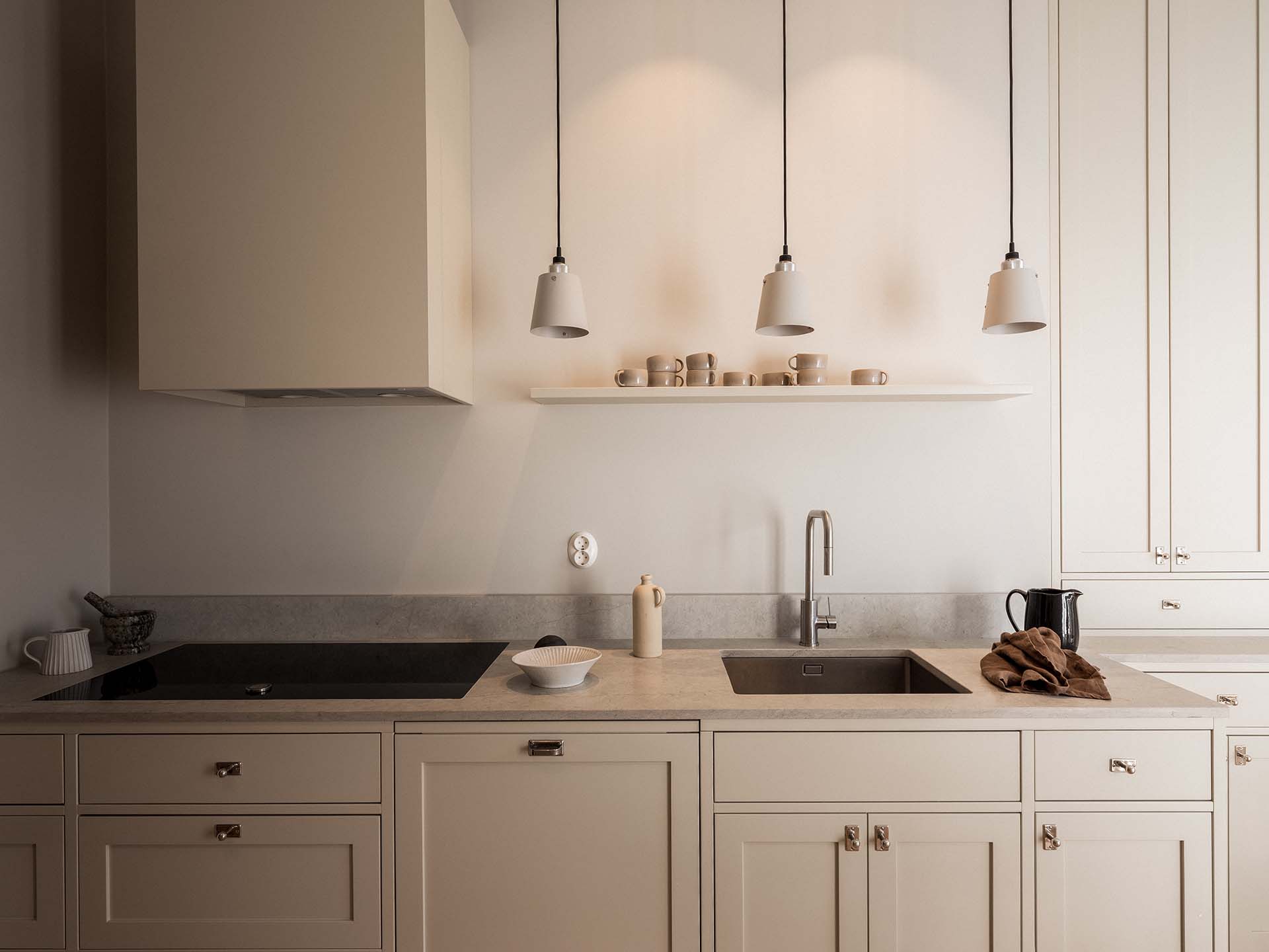The lighting in this shaker kitchen stands out as we have chosen pendants from Buster and Punch, model Hooked 1.0, which hang over the open part of the kitchen. Above the family dining table hangs a ceiling light of the same model, all to create a calm and to deliver details that are well thought out. The pendants provide a light that does not dazzle and thus creates a pleasant feeling in the evening. A tip is to plan exactly which luminaires you will have early in the construction phase as it is among the most important components for a luxurious feeling. We do not want you to feel that we missed a single detail, but our goal is to surprise you with that little extra in every project.
