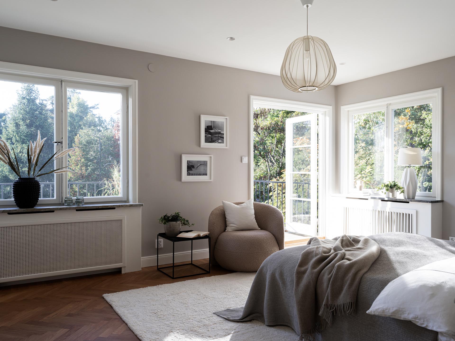 Stiligt - Ett modernt sovrum med neutrala färger, en säng i förgrunden, en byrå med en rund spegel, två öppna dörrar som de i en träkök med pocketdörrar, stora fönster, och minimalistisk inredning.