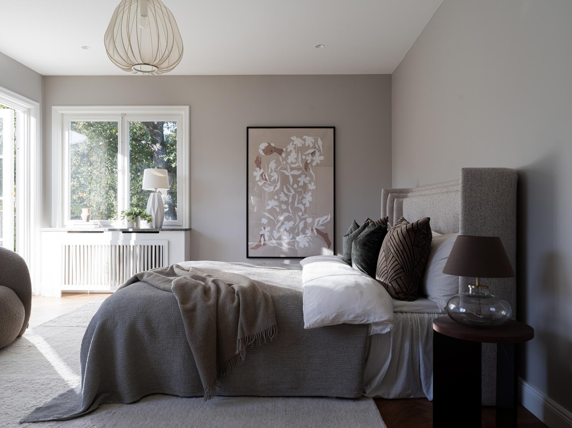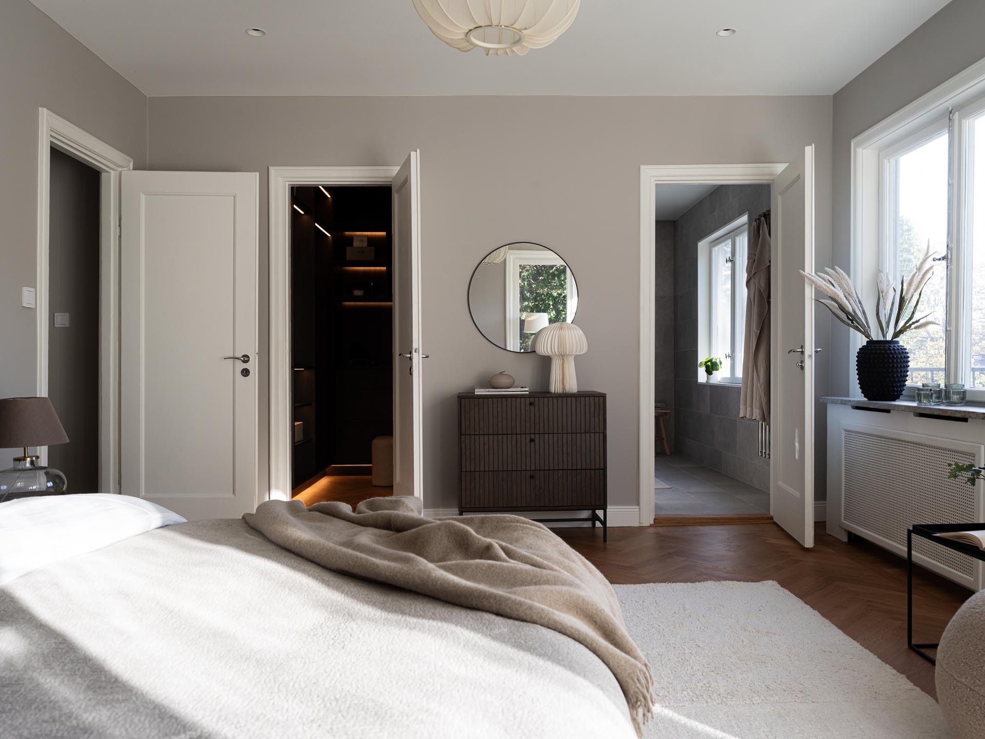 Luxury walk in closet In a beautiful manor house, we at Stiligt have created a master suite, which with its symmetrical design and harmonious choice of materials creates a calm and relaxing feeling.