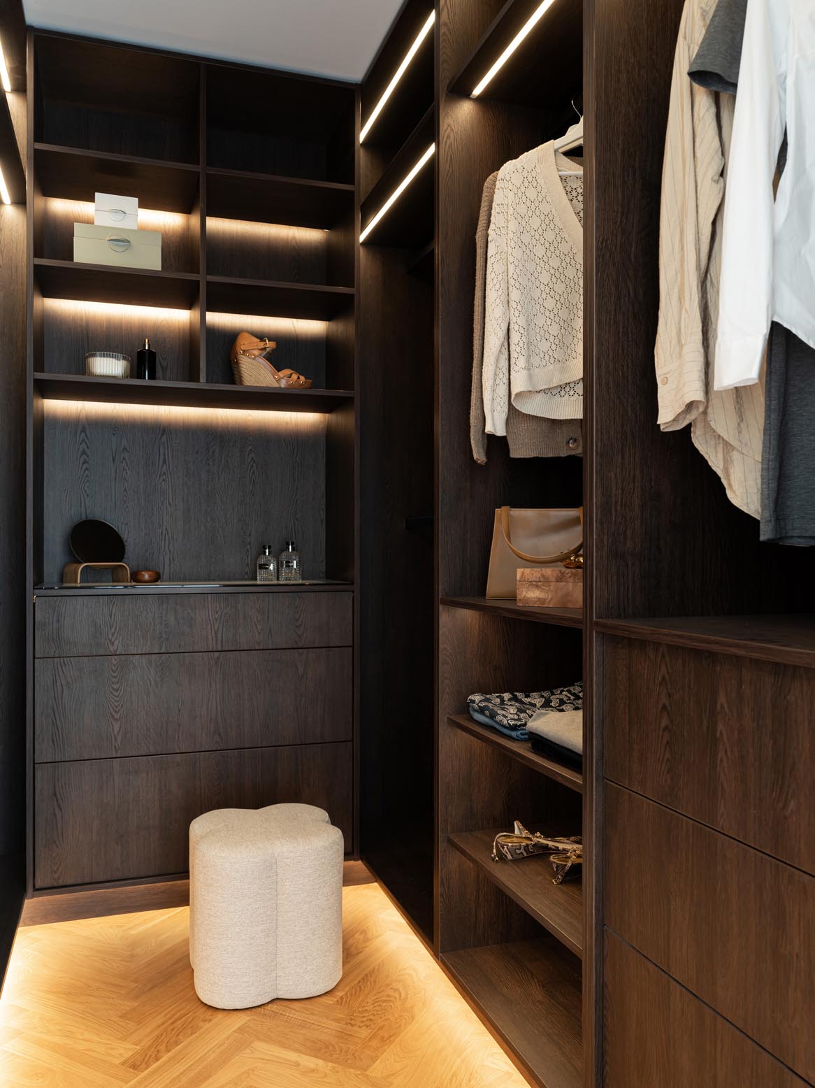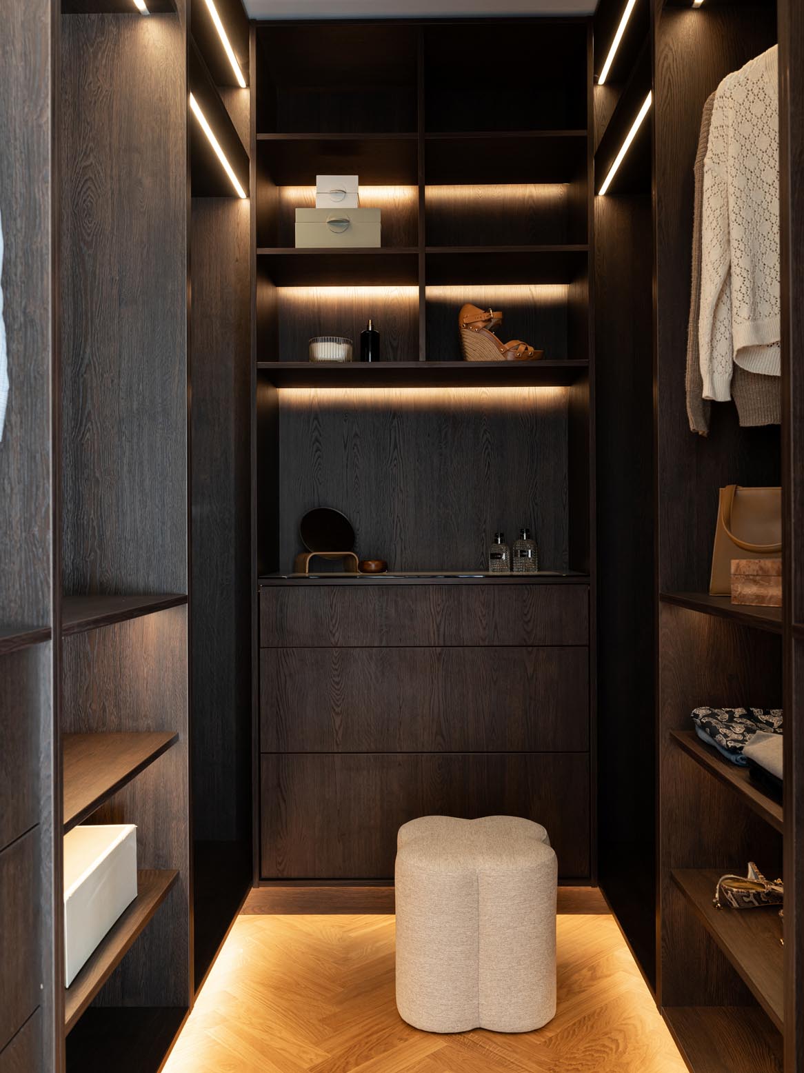 Discover our latest walk-in closet in dark oak laminate with LED lighting, smart storage and exclusive details. See this and more projects!