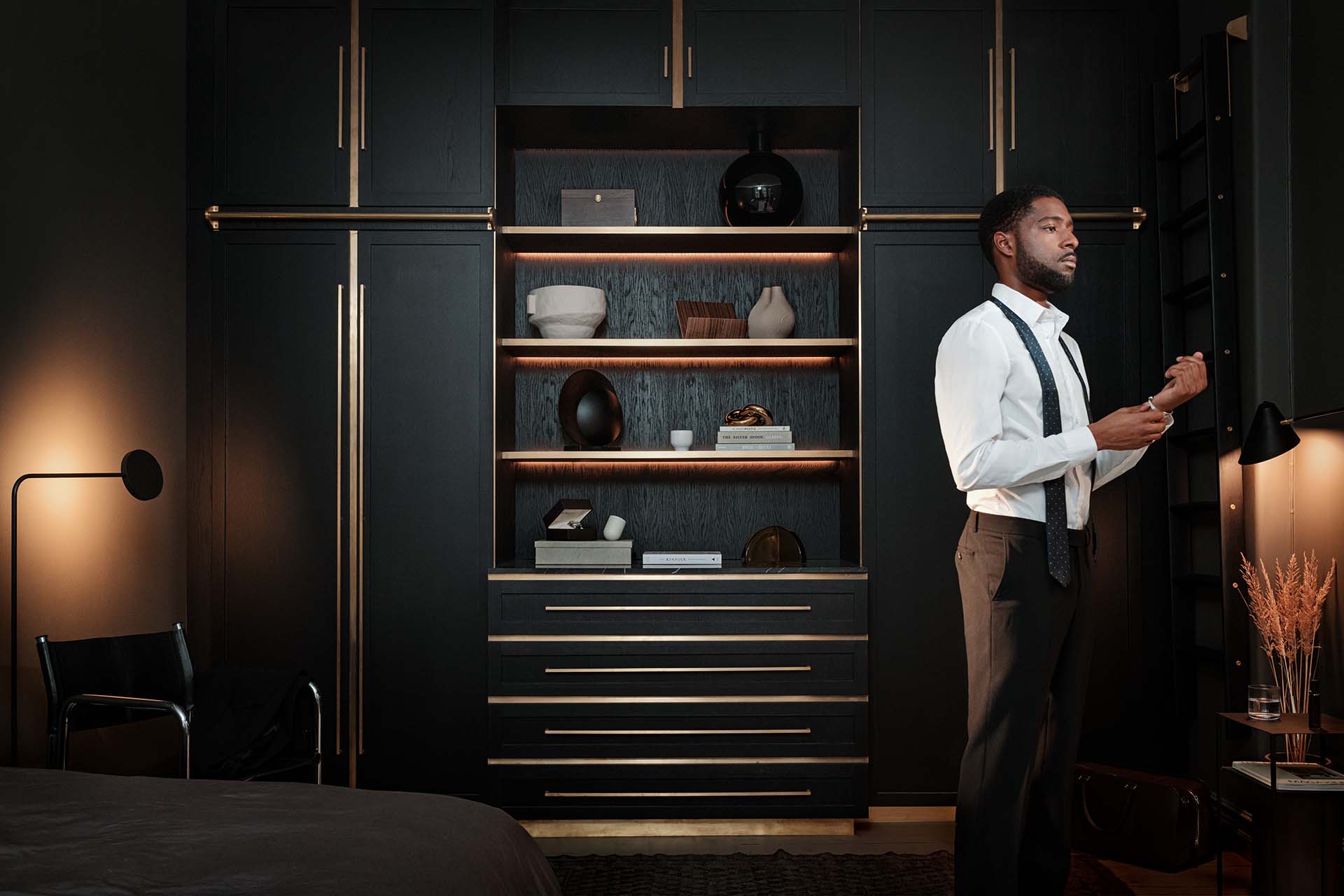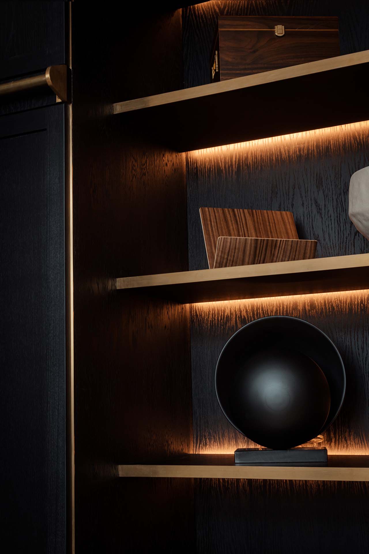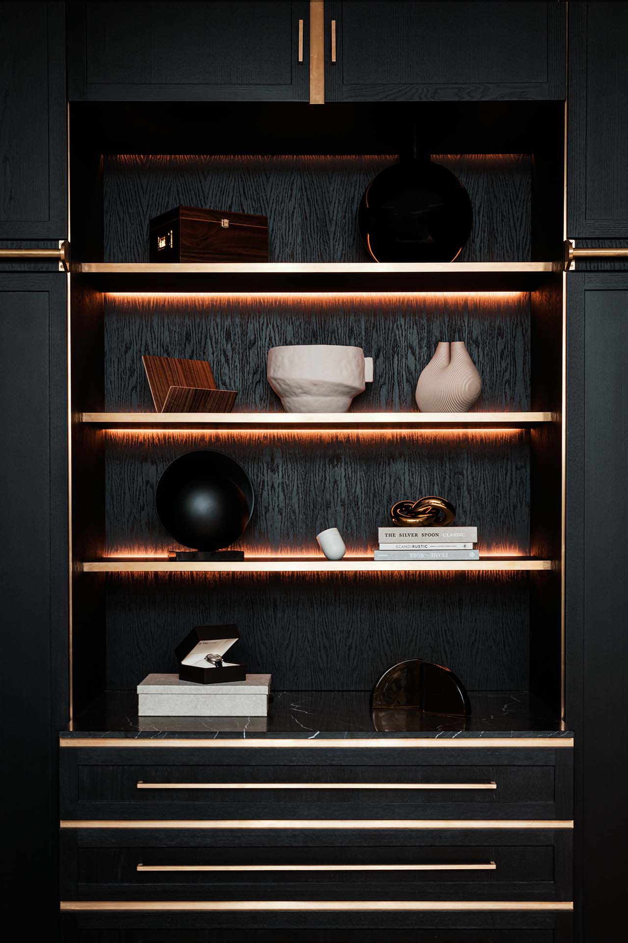The magnificent design of the wardrobe is enhanced by sumptuous lighting that makes the shelves float in the dark. The lighting is extra warm white (2400k) to match the brass. On a dark morning, the sensor-controlled lighting in the wardrobe comes on when you open the doors.