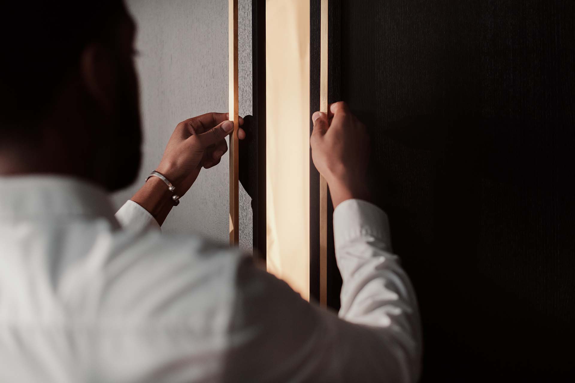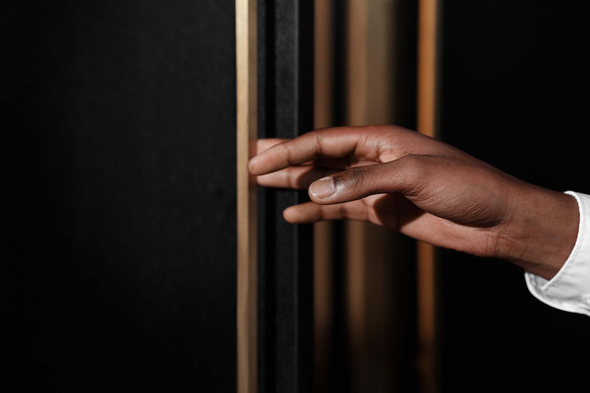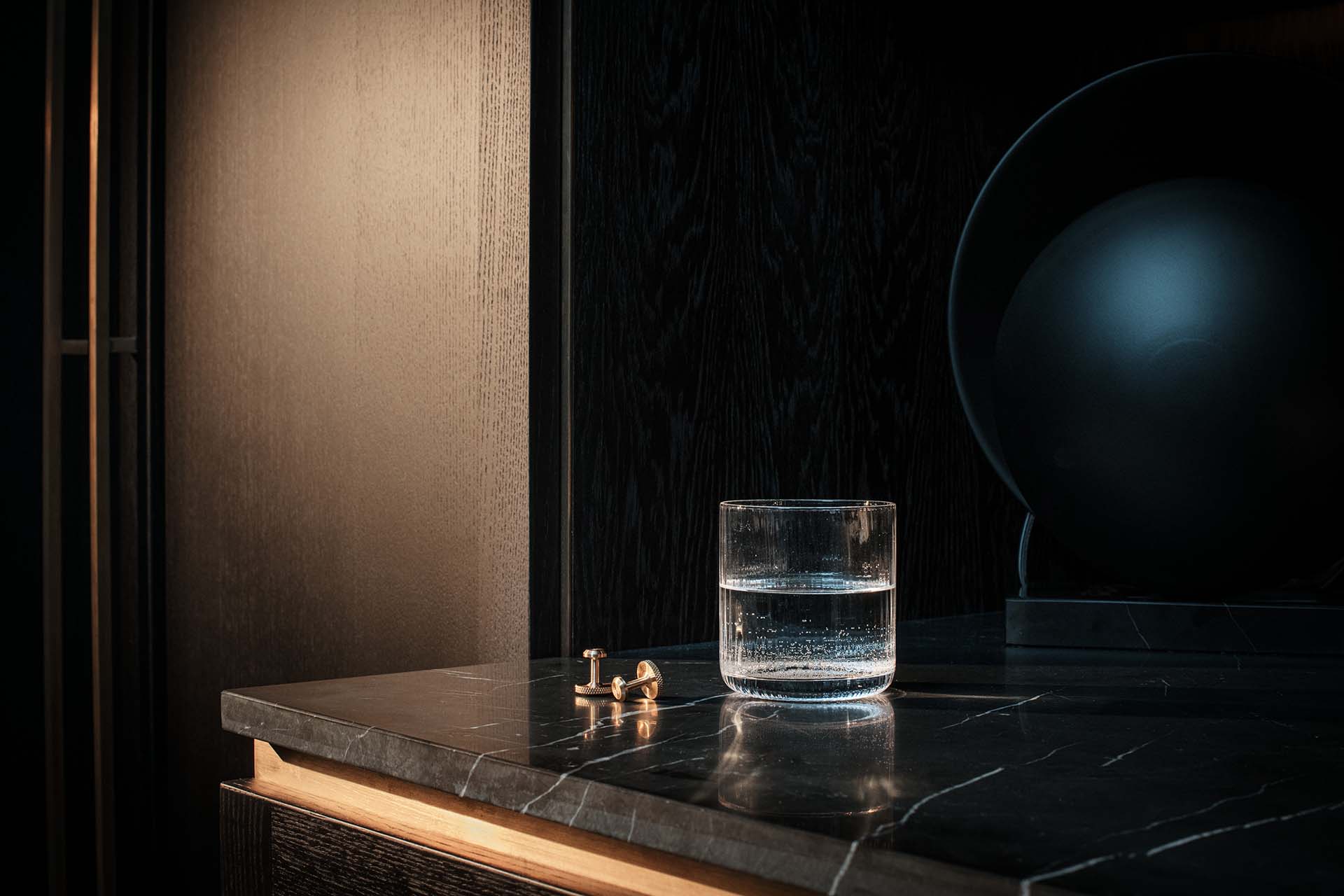 The magnificent design of the wardrobe is enhanced by sumptuous lighting that makes the shelves float in the dark. The lighting is extra warm white (2400k) to match the brass. On a dark morning, the sensor-controlled lighting in the wardrobe comes on when you open the doors.