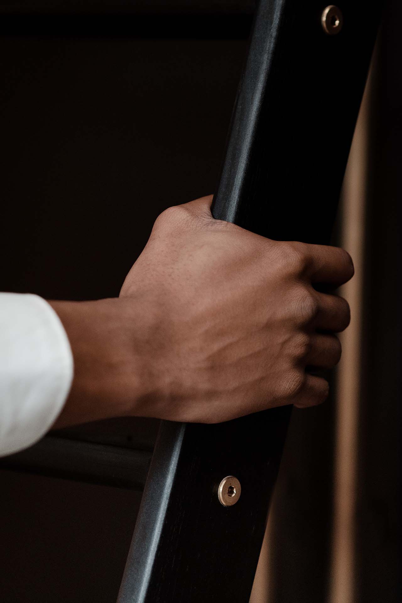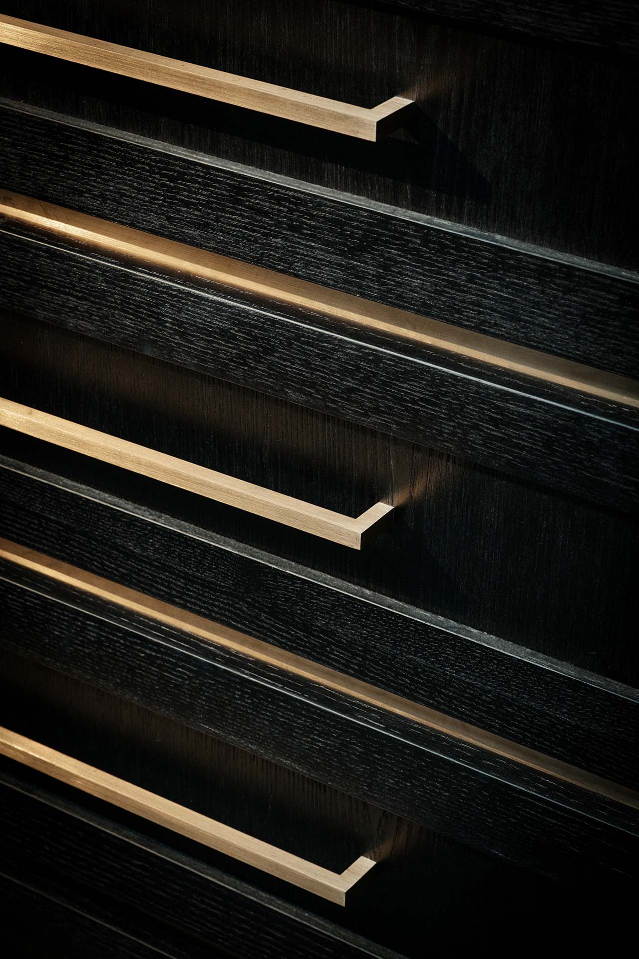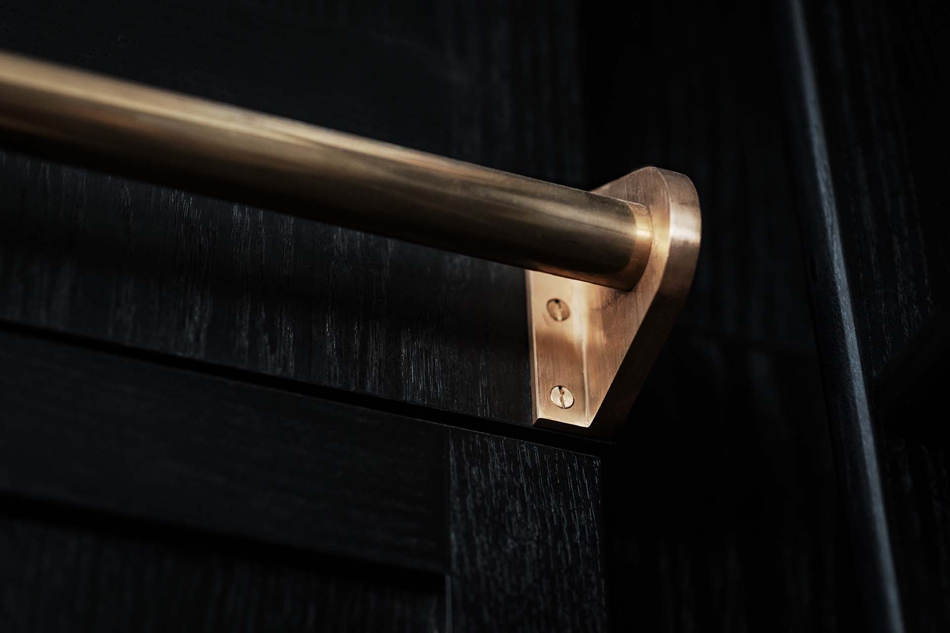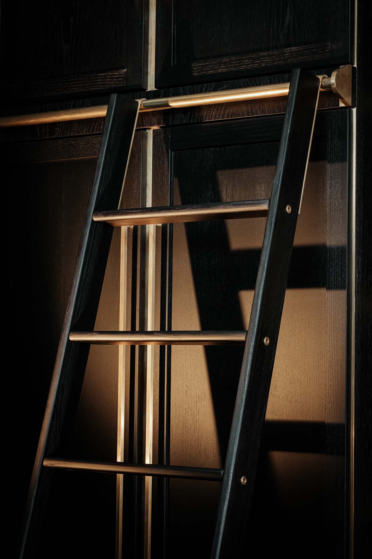Special solutions: CNC milled bracket for ladder bar; hand-welded and custom-made solid brass handles; brass front edges and plinths; black stained oak ladder with brass details;