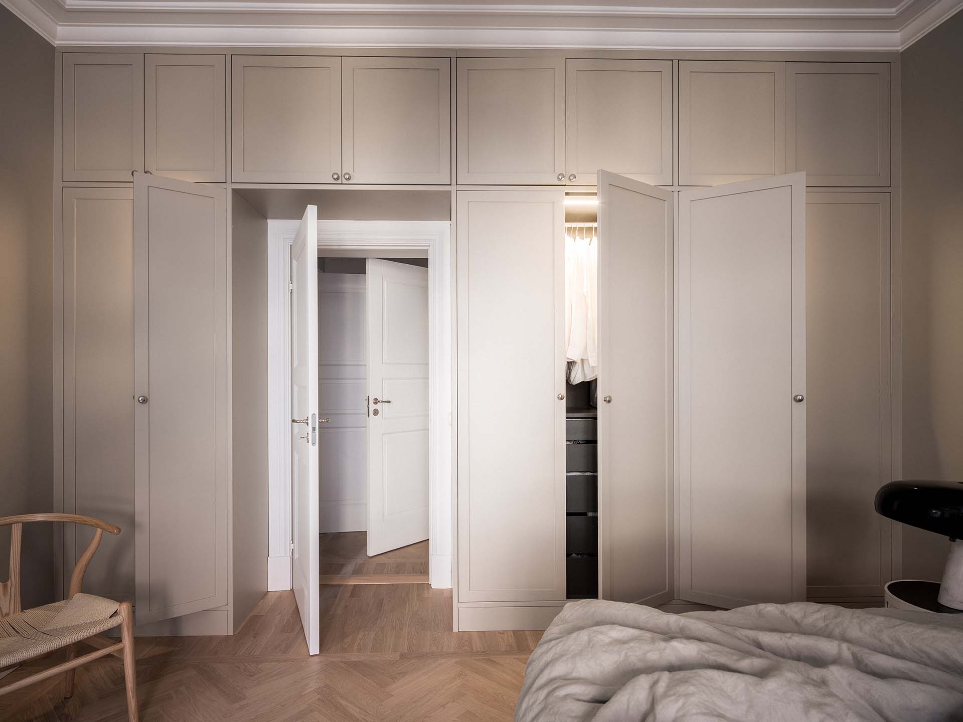 Of course, we want to bring that feeling into the bedroom when we design a bedroom wardrobe wall. Here it is important to follow the style, the feeling and take advantage of all the details that are available. Utilizing a generous ceiling height can sometimes feel impractical, but we all know that if there’s one thing you can never have too much of, it’s smart storage. If it is also bespoke and stylish, well then just take out a stool to reach the high cabinets.