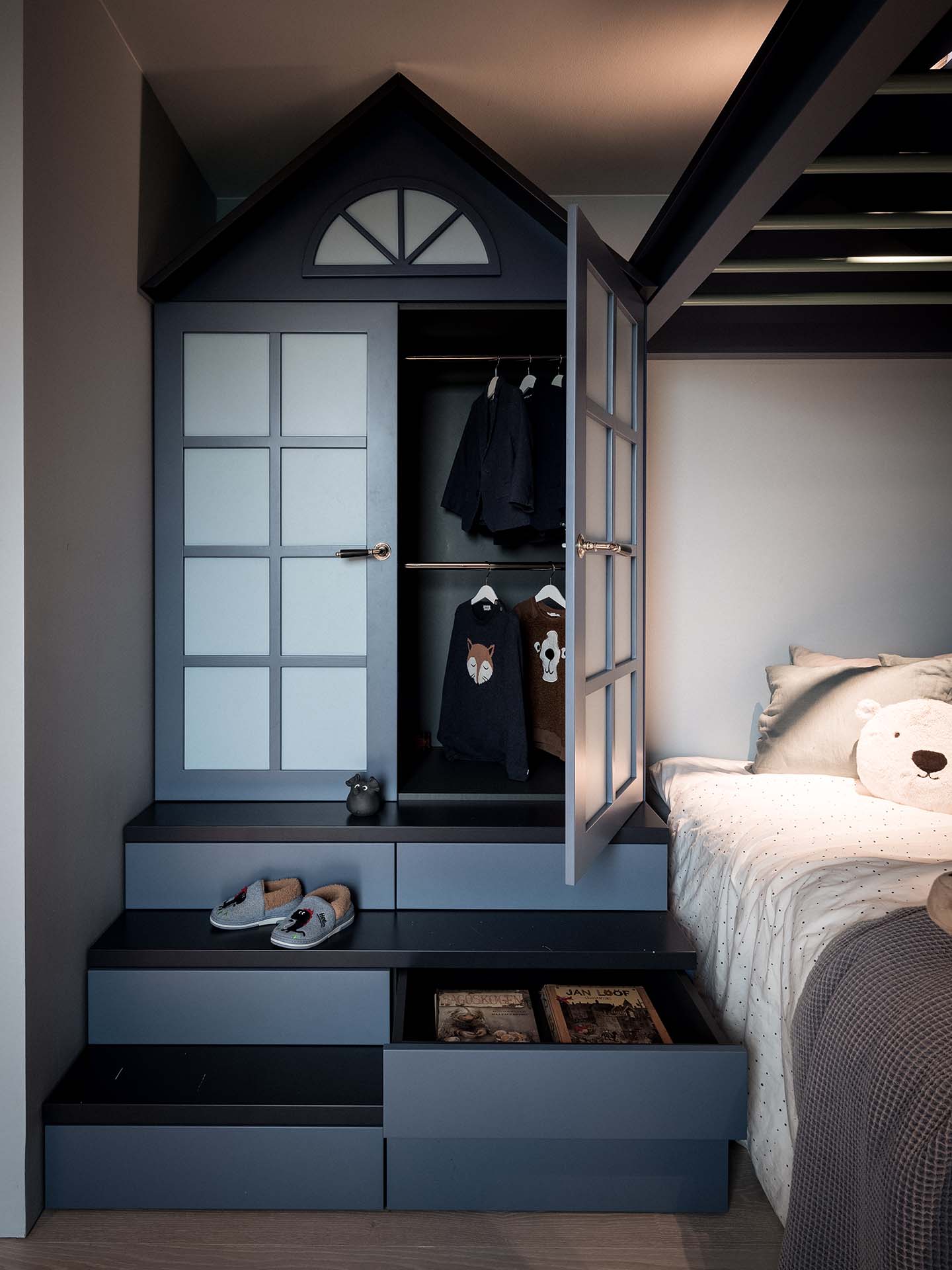 There is plenty of storage of various kinds and some of the drawers you have to look extra hard to see them. There are drawers on each step and they open with push-to-open to prevent the children from tripping or hurting themselves on any knobs or handles. The wardrobe, on the other hand, has a real door handle to reinforce the feeling that it is a house.