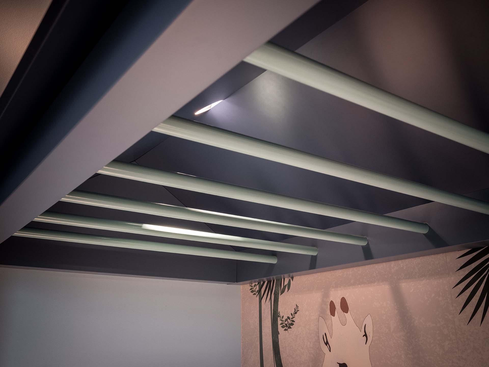 Stepping into this children’s room is like stepping into a completely different world. Who wouldn’t dream of having the jungle on the walls, being able to climb above the bed where you sleep well or read a book on the small staircase in front of the wardrobe? In this room, we have created a playful children’s room with a climbing frame where colors, patterns and materials are mixed but without it being too much or that the harmony and tranquility disappear. Thanks to the generously sized wardrobe, toys, books and other things that can make a children’s room cluttered can be accommodated and contribute to the calm feeling of the room.
