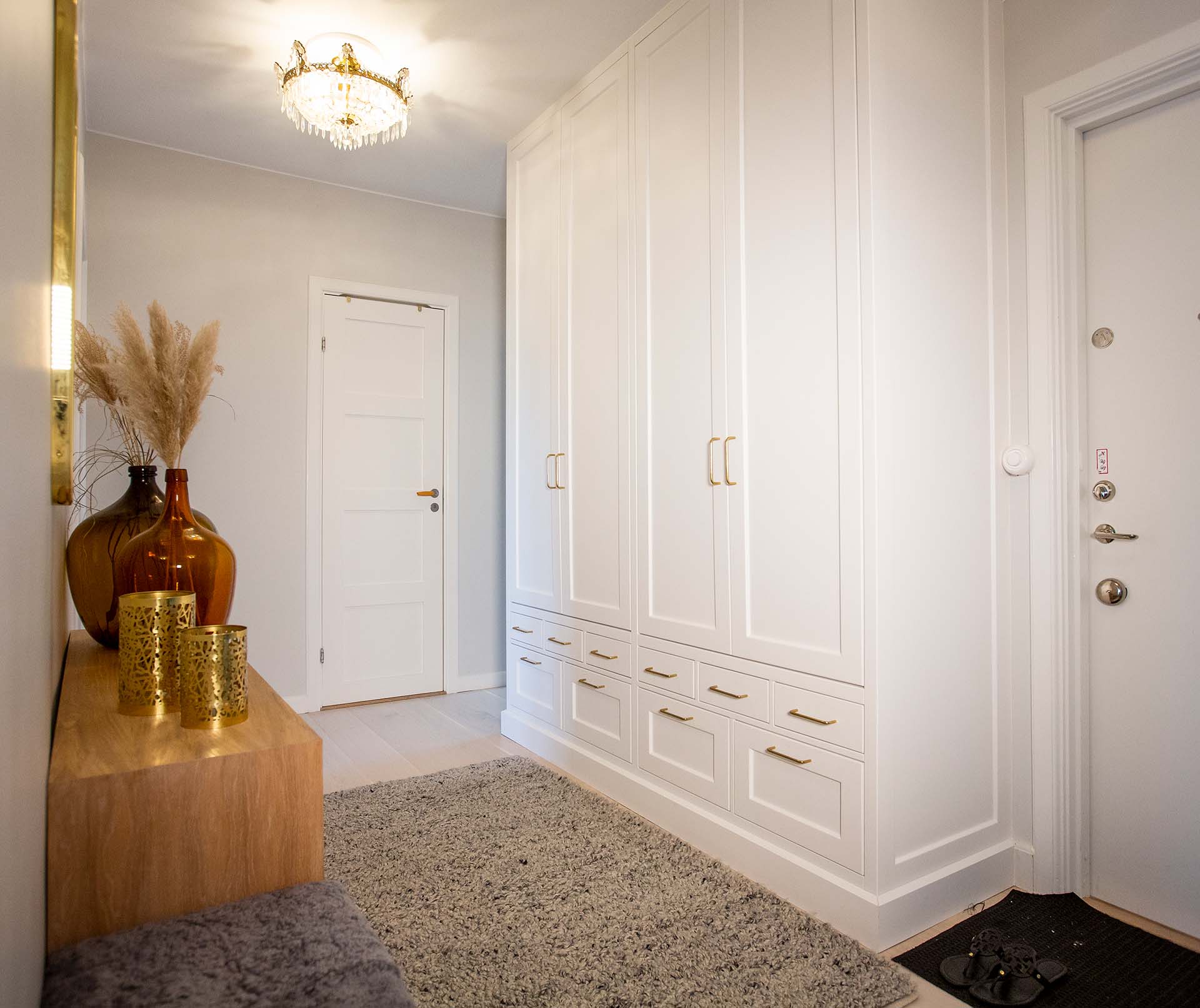 The space is maximized, yet the large hall furniture does not feel bulky. Classic, the white color blends in and the details are discreet while standing out. All the hall’s things fit in the generous wardrobe thanks to its combination of drawers in different sizes and plenty of space for outerwear. Of course, there is lighting behind the doors to further simplify everyday life.