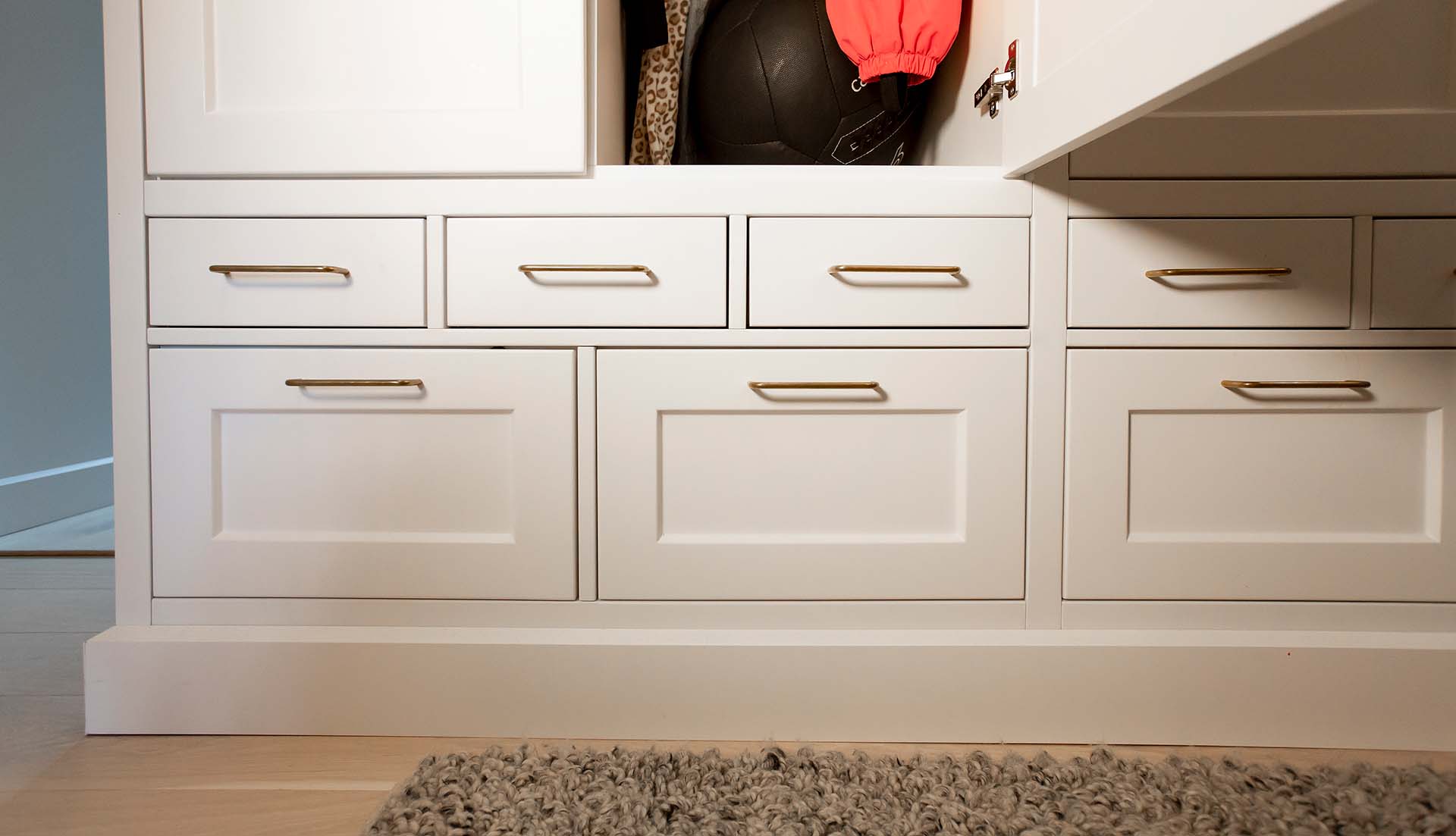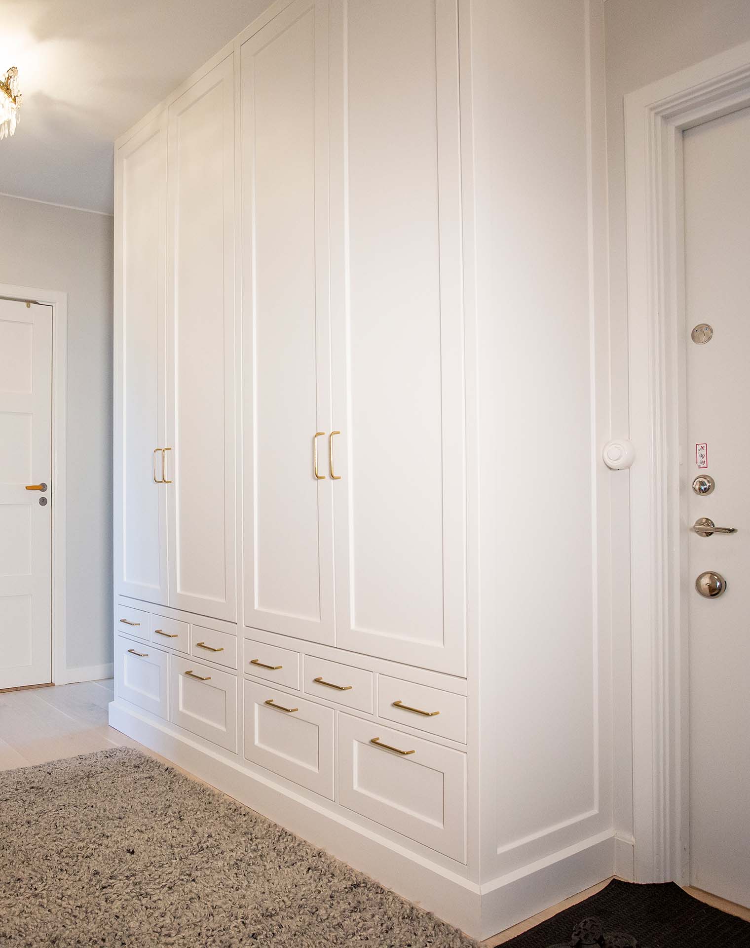 The family has a magnificent hallway wardrobe that, with its majestic high doors combined with the many drawers, makes life in the hallway easy. The small drawers with gold handles are not only details that stand out, but they make it easy to sort, store and structure all the things a wardrobe in the hall should accommodate. Make the most of the ceiling height and build your wardrobe from floor to ceiling, let the wide plinth frame it and feel the perfection of the craftsmanship when all the details are in place.