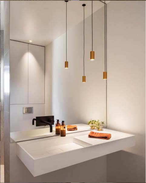 Stiligt - Villa Fernströms badrum Minimalistiskt badrum med stiligt vitt flytande handfat, elegant svart kran och eleganta hängande lampor. Två orangea handdukar lägger till en färgklick nära en liten växt på bänken.