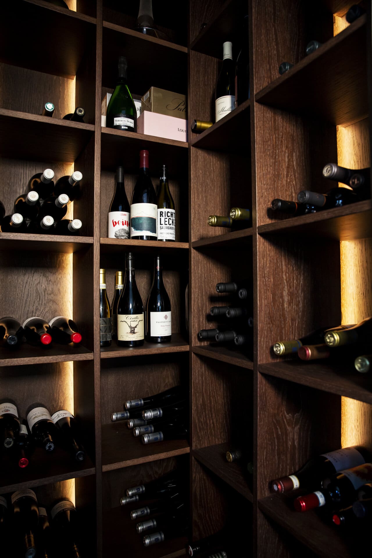 The illuminated shelves highlight each bottle as part of the décor, and the tailored storage solutions make it easy to organize and sort different types of wines. This wine room combines functionality with aesthetics, creating a space where every detail contributes to an overall experience of luxury and enjoyment. The modern lighting, combined with the warm wood, creates an inviting atmosphere that makes the room a place for both storage and enjoyment.