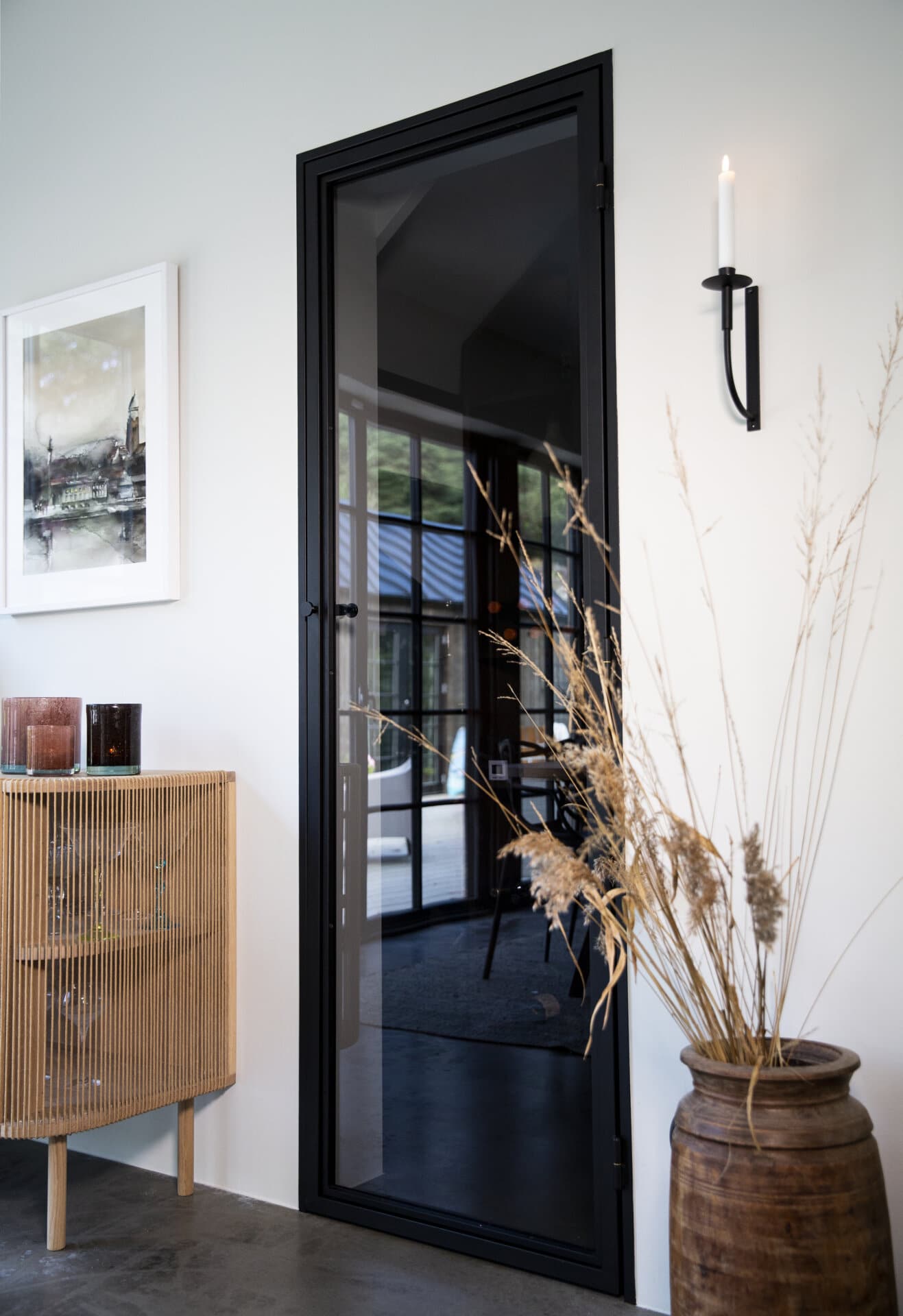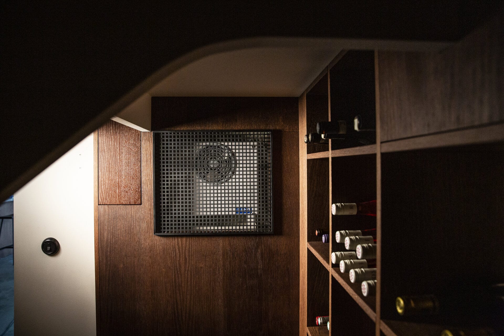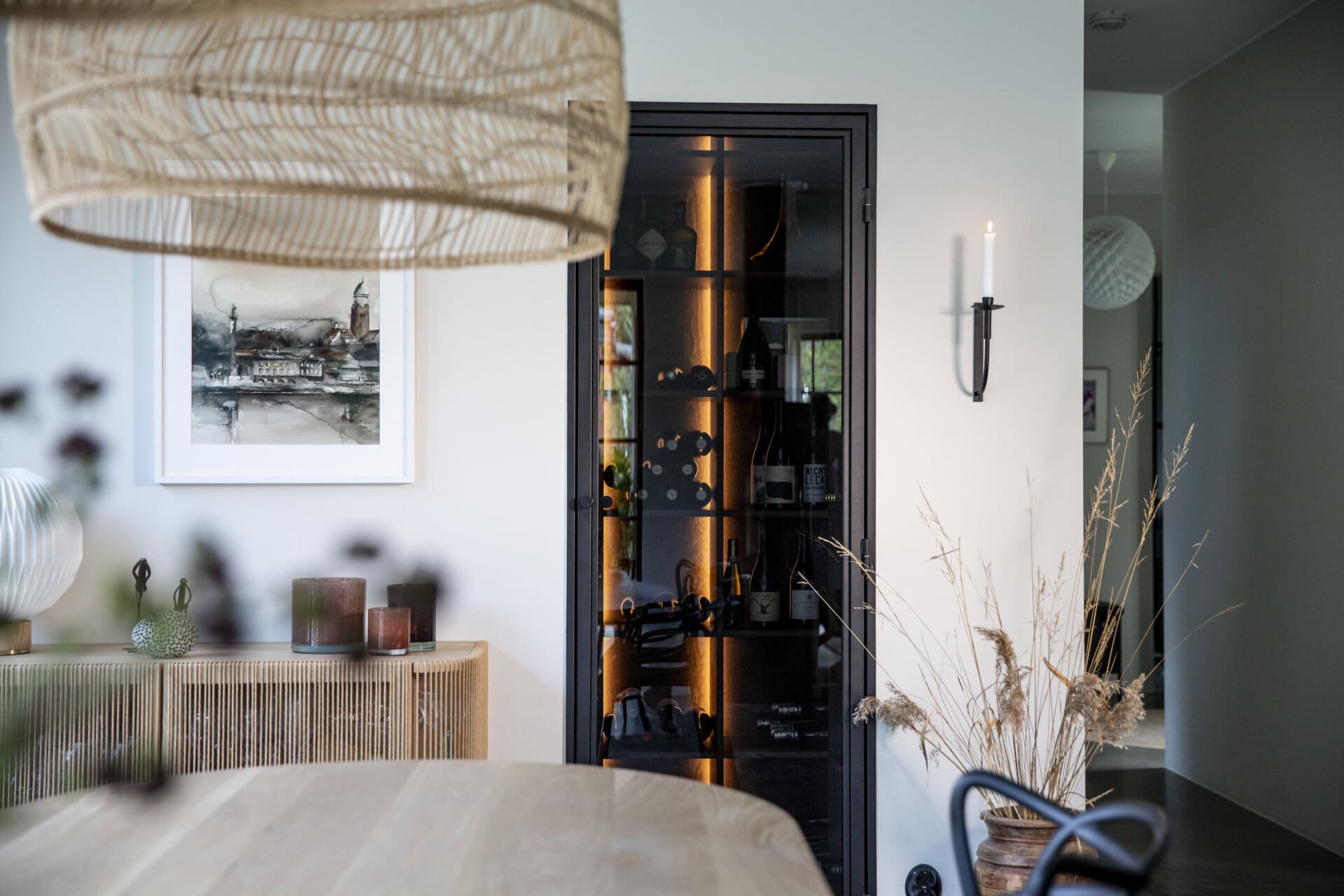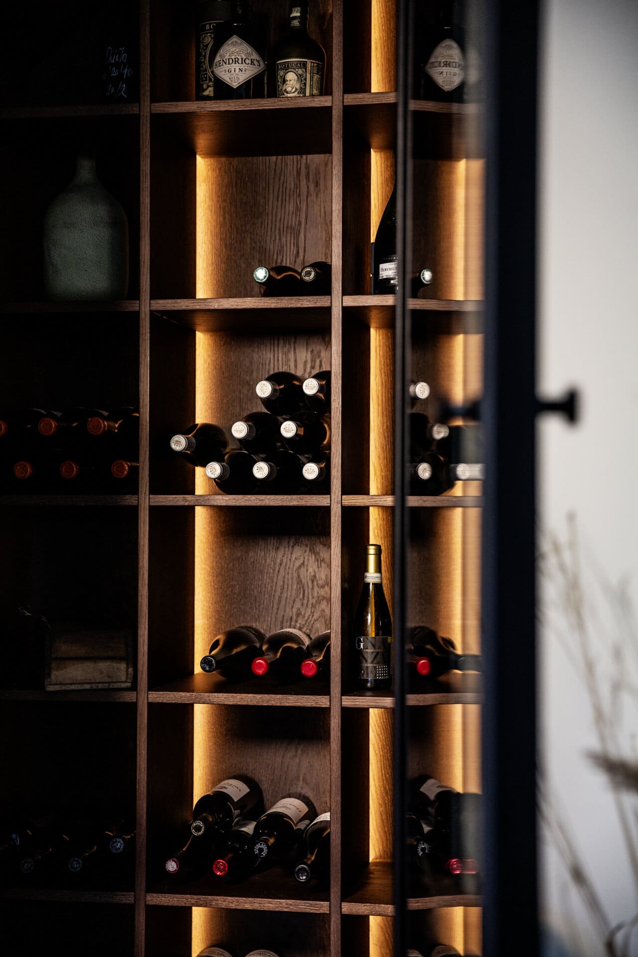 This on-site wine room is an elegant and functional space that makes smart and stylish use of every centimeter under the stairs. Integrating the wine storage directly under the stairs creates a discreet yet luxurious space where every aspect has been designed with precision to ensure optimal wine storage and an exclusive experience. The wine room is accessed through a beautiful cast iron door that opens directly onto the dining area. This door not only provides a dramatic setting, but also creates a natural and luxurious transition between the dining area and the wine storage.