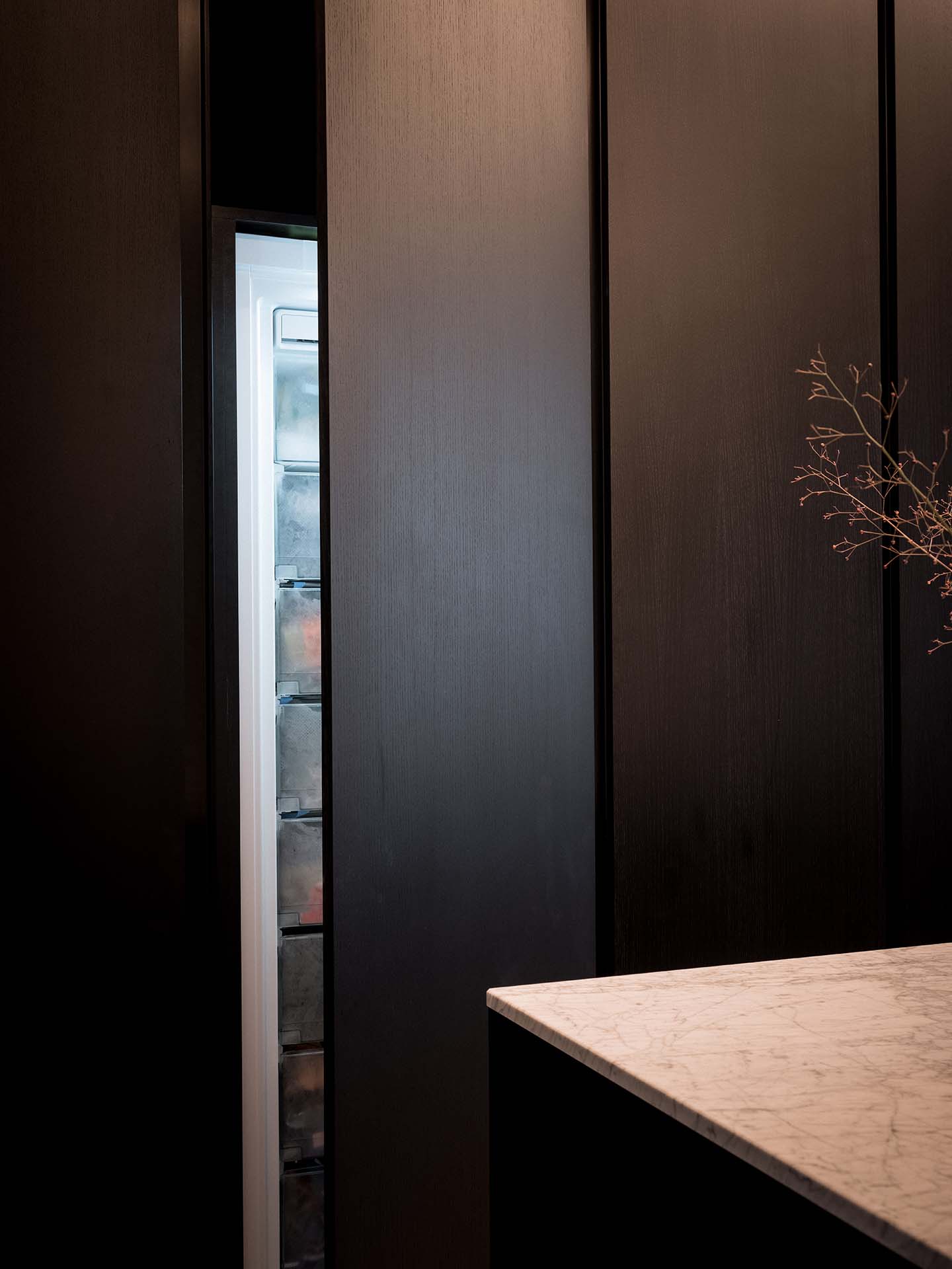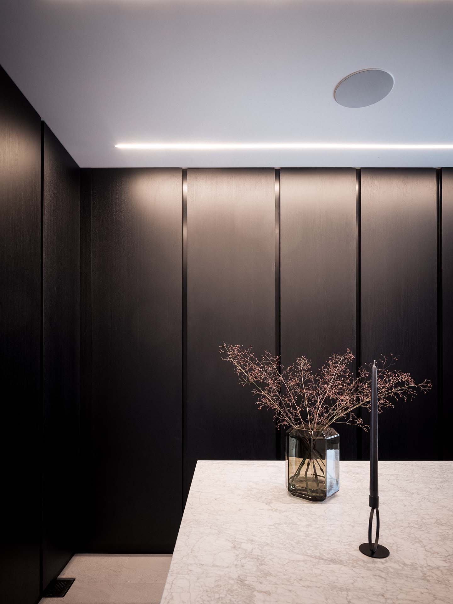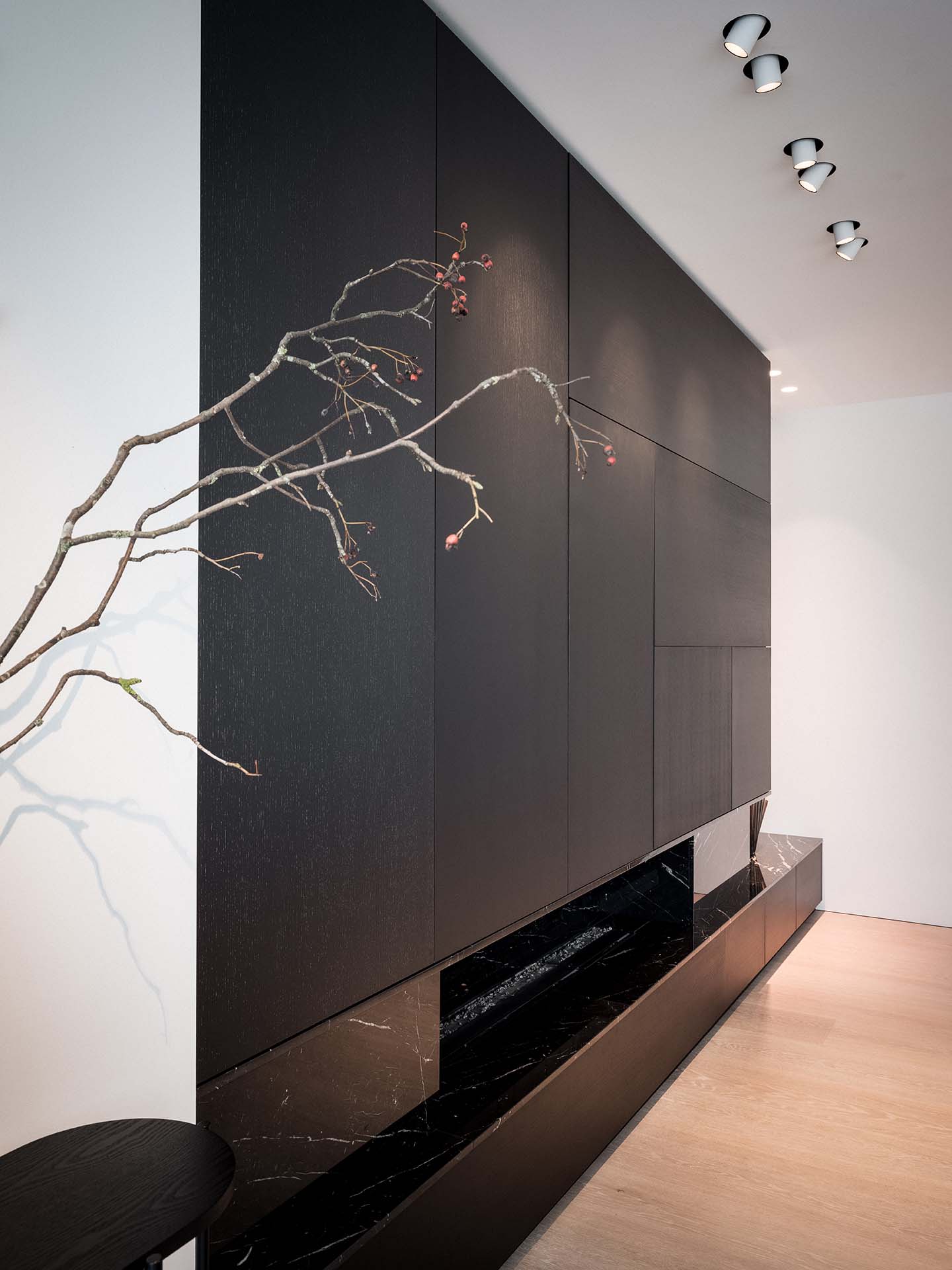 This is a walk-in closet, located adjacent to the entrance, intended for hanging up coats and shoes. With an opening without doors, it is extra important that the room provides a tidy sight in passing. With black wardrobes that extend from side to side and floor to ceiling. Without pass-throughs.
