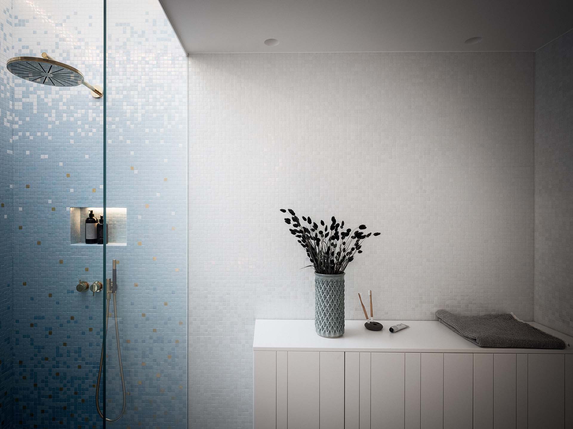Platsbyggt badrumsskåp vitt vola mässingsblandare mosaik