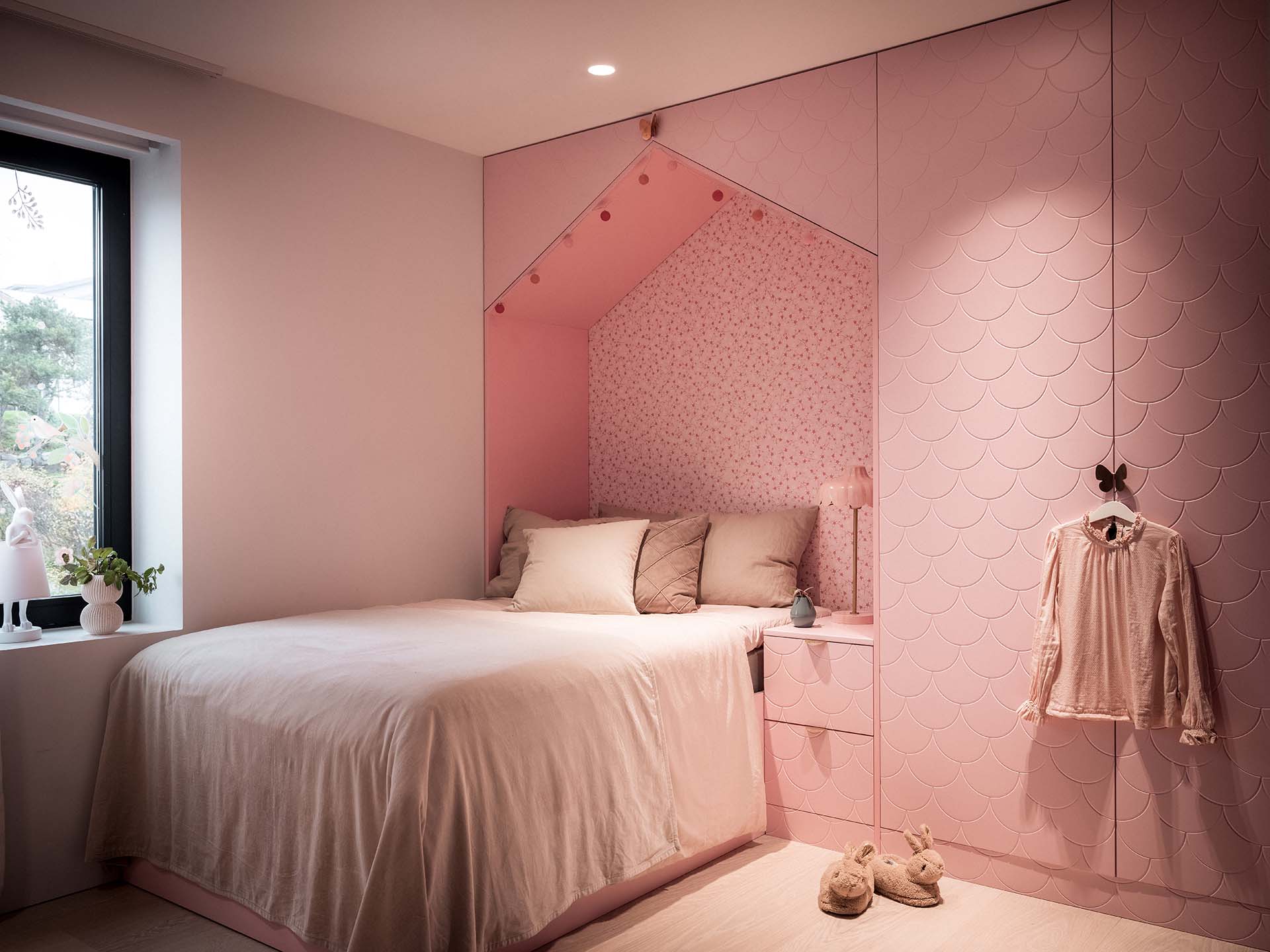 Stiligt - Sovrum i Stiligt rosa tema med säng, dekorativa tapeter och en väggmonterad nattlampa. En klänning hänger på en krok, medan mjuk belysning och växter vid fönstret kompletterar det mysiga rummet.