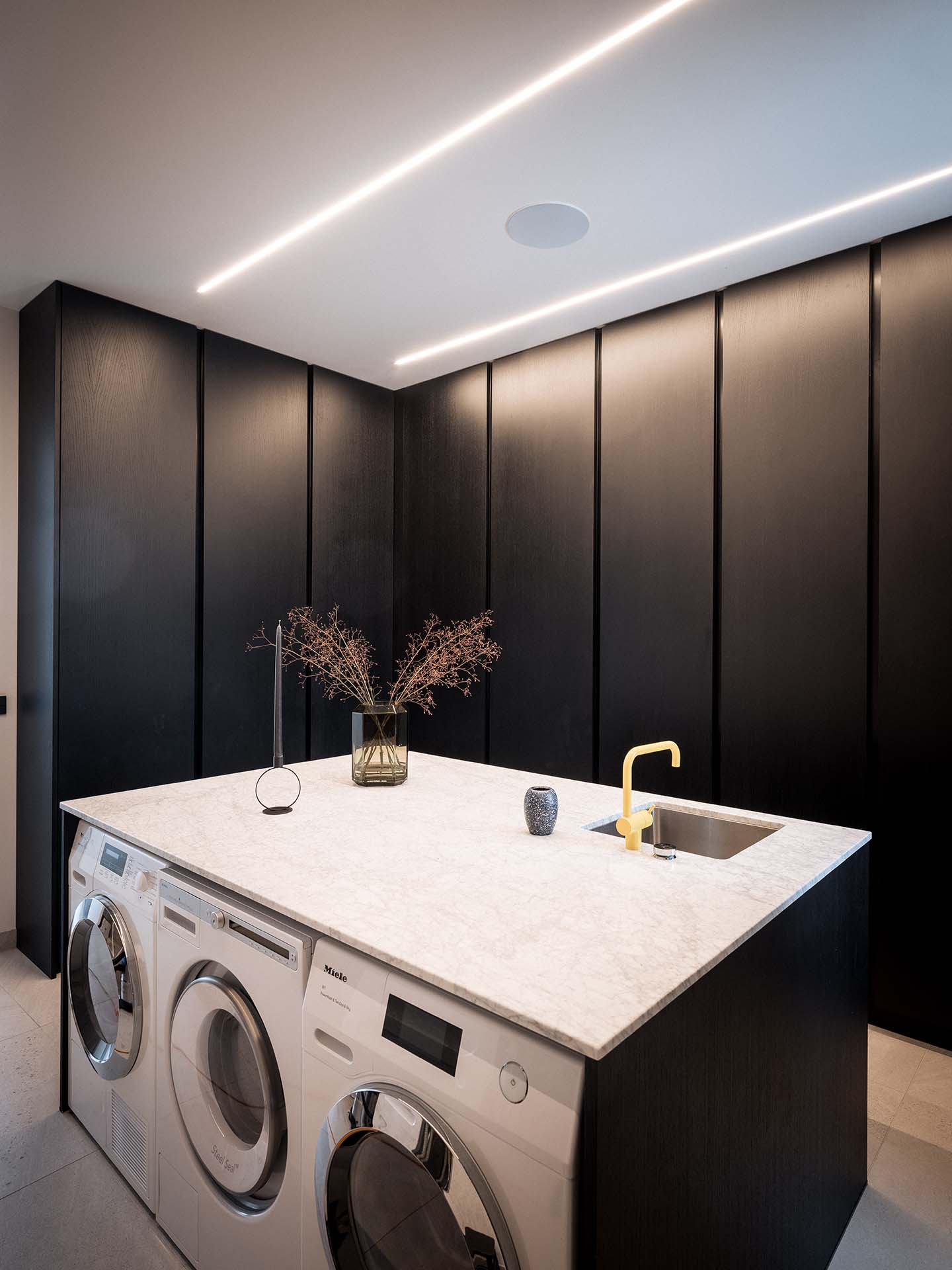 Tvättstuga tvättmaskin skåp miele marmor bänkskiva vola blandare